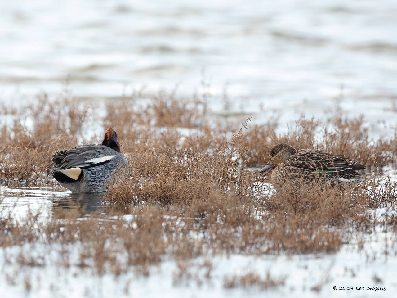 Een van mijn favoriete eendjes. Niet groot zijn ze, ca. 35 cm groot en 350 gram, daarmee de kleinste eend die in Europa voorkomt. Gelukkig niet zeldzaam, ik zag er weer een heleboel gisteren daar aan de Gortzakweg aan het eind van de Oesterdam daar vooraan in Zeeland. Het bruin van het kruintje van dit mannetje past mooi bij de kleur van de verweerde planten in het ondiepe water. Er is nog net iets van het groene spiegeltje in de vleugel te zien.