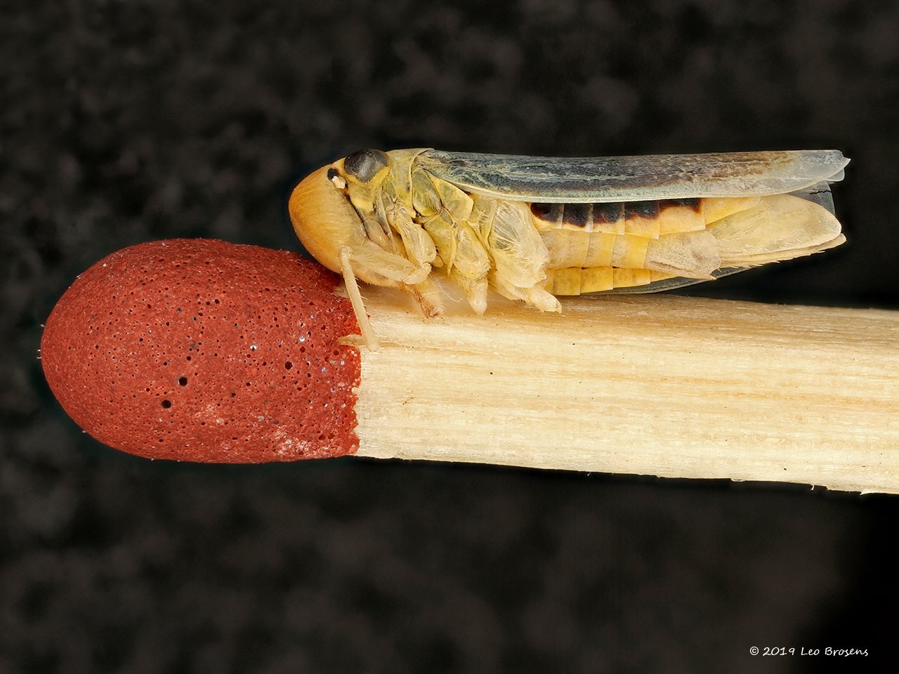 Een poos terug vond ik binnen op de vensterbank een vuiltje. Dat vuiltje bleek een dood beestje. Het bleek een klein cicade'tje van slechts 6 mm groot te zijn. Wellicht een groene cicade uit de hele grote familie van Cicadellidae. Ik heb mijn macrolens nog eens opgezocht en een vooraanzichtje gemaakt, 3 op 1 met de Canon MP-E 65 lens. Heb meerdere foto's gemaakt en de meest scherpe delen bij elkaar gevoegd met een speciale app. Het diertje mist een van de kleine antennes op de kop. Die kop is stomp en je ziet geen mond. Dat komt omdat cicaden geen normale mond hebben maar wel een soort steekbuis die naar achteren wijst en hier niet te zien is en waarmee ze plantensappen aftappen. Dat kunnen ze heel goed en zo vormen ze nogal eens een plaag bij de groentekweker. Ze kunnen ook ziektes over brengen. Eén legsel van het vrouwtje kan uit honderden eitjes bestaan die binnen de zes tot acht weken uitkomen. Volwassen dwergcicaden springen of vliegen bij het minste gevaar weg. De jongen hebben nog geen vleugels en kruipen naar de onderkant of de schaduwkant van het blad. Hierdoor zijn de dwergcicaden vaak onopgemerkt op bomen of planten.