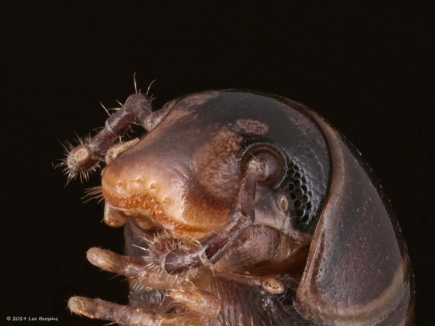 Het aantal poten is vaak een belangrijk kenmerk voor het soort diertje dat je voor je hebt. Zo hebben insecten in de regel zes poten. Dit beestje heeft er echter veel meer dan zes. Het blijkt dan ook een Myriapoda (duizendpoot) te zijn en geen Hexapoda (zespoot). We moeten het diertje daarom ook geen insect noemen. Het diertje is minder ontwikkeld, minder ver geëvolueerd dan een insect. Denk daarbij aan de bouw van het ademhalingssysteem, het zenuwsysteem, de zintuigen. Het is dus een heel oud ontwerp dit beestje, erg succesvol zou je zo ook kunnen zeggen. De bouw is een soort systeembouw van aan elkaar gebouwde segmenten. De meeste segmenten zijn voorzien van poten. Nu zien we hier bij de achterste segmenten, wat hier uit twee delen samengestelde segmenten zijn, per segment twee paar poten en dat maakt dat we hier een Diplopoda hebben, in de regel een miljoenpoot genoemd. De primitieve slechte ogen zijn uit een aantal ocellen opgebouwd, die lijken nog minder goed tegen elkaar te zijn geordend als in de regel bij insecten. De Myriapoda zijn vaak giftig, ze kunnen gif uit poriën stuwen. Ze zijn geen lekker hapje op die manier en dat helpt de overleving. Nog leuk hier om te zien is het geslachtsorgaan, die twee pinnetjes die uit de onderbuik te voorschijn komen bij het vijfde segment. Als de miljoenpoot ouder wordt, als die groeit, gaat dat gepaard met vervellen. Het oude pantser wordt afgeworpen en maakt plaats voor een grotere jas waarbij ook het aantal segmenten nog kan toenemen. (Ik ben geen bioloog en hoop een en ander een beetje juist te hebben verwoord?)(Foto gemaakt met Canon MP-E65mm lens op 4x uit een stack van 24 opnames)(Heb hier in de hoek het diertje naast een gewone kleine lucifer getoond om de werkelijke grootte te kunnen inchatten).
