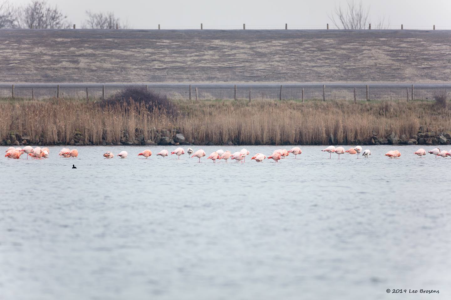 Bijna veertig jaar terug ontsnapten een aantal flamingo's uit een privecollectie en die kwamen terecht in een natuurgebied net over de grens met Duitsland bij Groenloo, bij het Zwillbrocker Venn om precies te zijn. Dat ven vriest in de winter dicht en de flamingo's moeten zo 's winters op de wieken om open water en zo voedsel te vinden. Ze ontdekten dat het Grevelingenmeer voldoende zout was om niet dicht te vriezen in de winter. Gelukkig voor de flamingo's bleek het water daar ook nog eens voldoende voedsel voor de vogels te bevatten en voldoende ondiepe plekken te hebben op maat voor de lange poten. Het gaat zo al jaren goed met deze prachtige vogels. De laatste jaren is de hechte groep zelfs in aantal gegroeid. Ikzelf telde er nu 63 exemplaren. De groep bestaat uit verschillende soorten en uit hybriden daarvan.