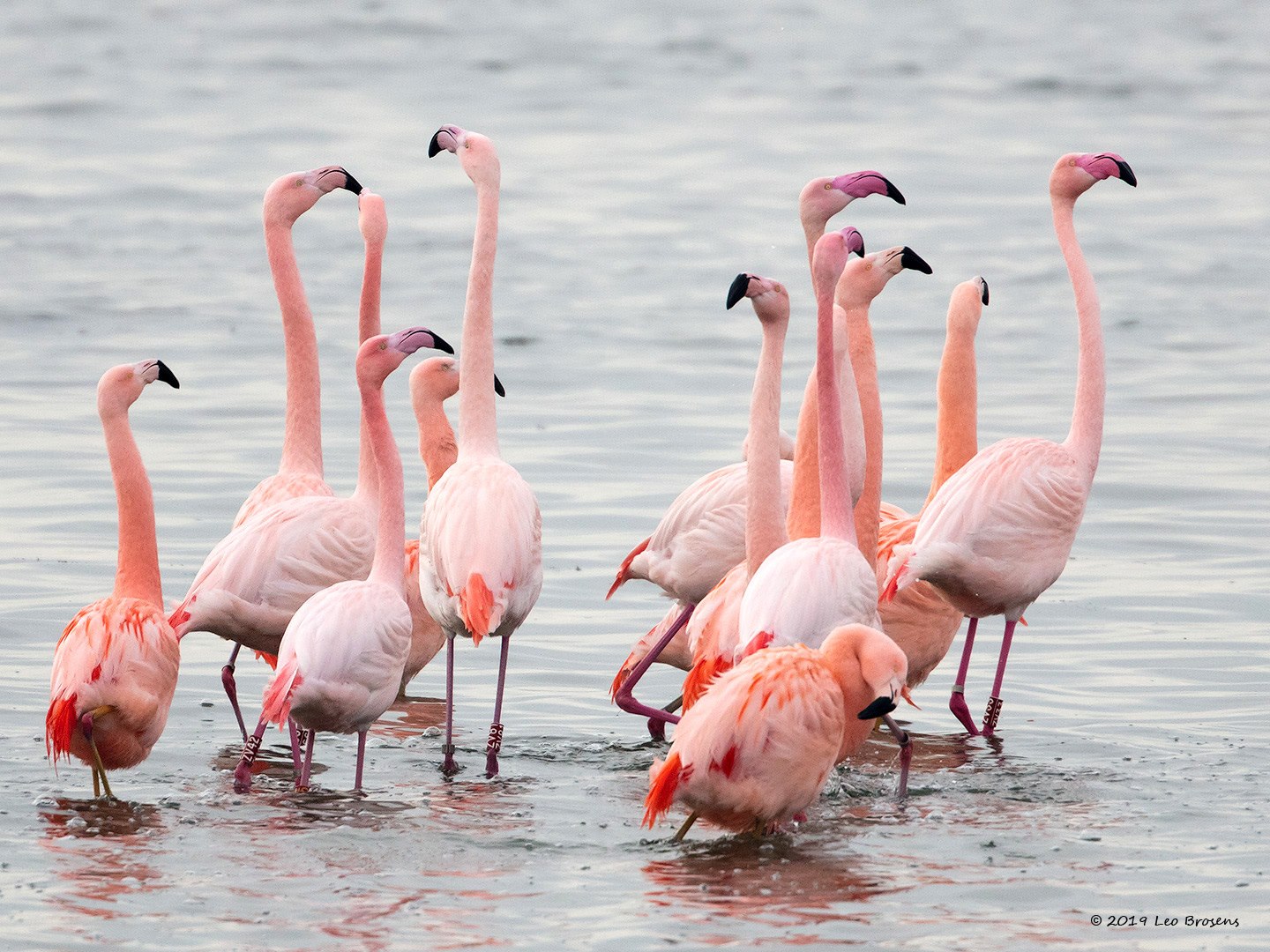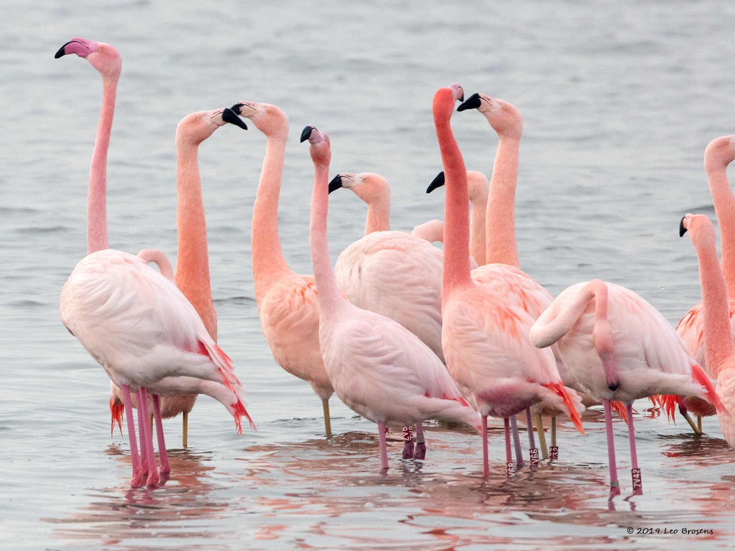 Je kunt goed het verschil zien tussen de kleinere chileense flamingo en de grotere europese. Die kleine chileense heeft zwart op de snavel tot in de hoek van de snavel, heeft een korte dikke nek en heeft grijsgele poten met een rode knie. Daar in het Zwillbrocker Venn zijn allerlei vriendschappen ontstaan waardoor enkele vreemde kindjes ofwel hybriden zijn ontstaan. De hechte groep wordt door iedereen met rust gelaten, er wordt geen enkel beheer op uitgevoerd. Wel wordt alles goed bijgehouden, zo krijgen de baby's allemaal een herkenningsring, je ziet er hier verschillend aan de poten zitten.