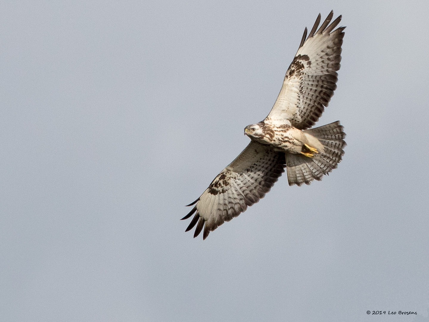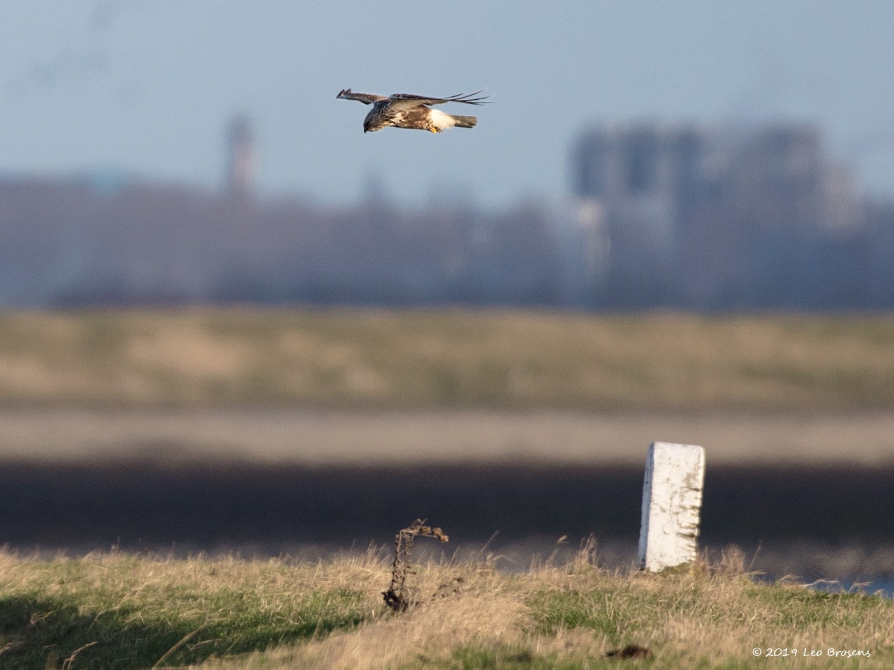 Ik had ooit in 2011 eens een ruigpootbuizerd voor het eerst zien vliegen bij de Stompe toren daar in Zeeland maar deze gisteren bij Scherpenisse liet zich beter zien. Ruigpootbuizerds broeden in Scandinavië, en verder oostelijk over de toendrazone richting de Grote Oceaan, ook wel in het noorden van Noord-Amerika. De Scandinavische vogels overwinteren in het westen en midden van Europa. In Nederland een vrij zeldzame wintergast, die de laatste decennia in aantal lijkt te zijn afgenomen. De naam duidt er al op, de poten zijn niet kaal maar tot aan de tenen (ruig) bevederd. Bij de buizerd, die er soms verrassend veel op kan lijken, zijn de poten steeds kaal.