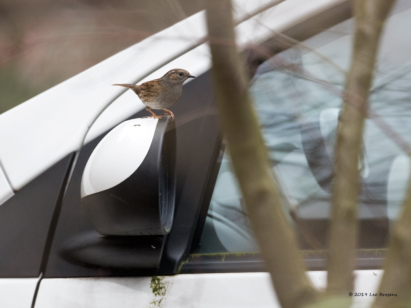 Een zachte winter, mooi weer, het voorjaar meldt zich. Dat voorjaar is in het koppie van deze heggenmus gekropen. De hormonen werden opgestart en nu is ie kwaad op van alles. Ook op zijn eigen spiegelbeeld dat ie ziet in de autoruit en in de autospiegel. We zagen de heggenmus allemaal bezig bij die spiegel. Om de zoveel minuten kwam ie zich even druk maken, de poepjes op de spiegel verraden dat ook. Toch maar geprobeerd er een foto van te maken. Daarom voorzichtig met camera de tuin in geslopen en mijn geduld getest. Het lukte om deze plaatjes te maken, deels door de struiken heen. Op de spiegel zittend boog ie steeds voorover om te zien waar de concurrent zat daar in die spiegel. Zittend bij het raam had ie het helemaal niet meer, daar zag ie zelfs drie concurrenten, een spiegelbeeld voor hem in het raam plus twee in de spiegel, een van hem en een van zijn spiegelbeeld. Even later zag ik een tweede heggenmus, vast een dame want de achtervolging en begroeting werd ingezet. Komt dus vast goed met de heggenmus bij ons in de tuin.