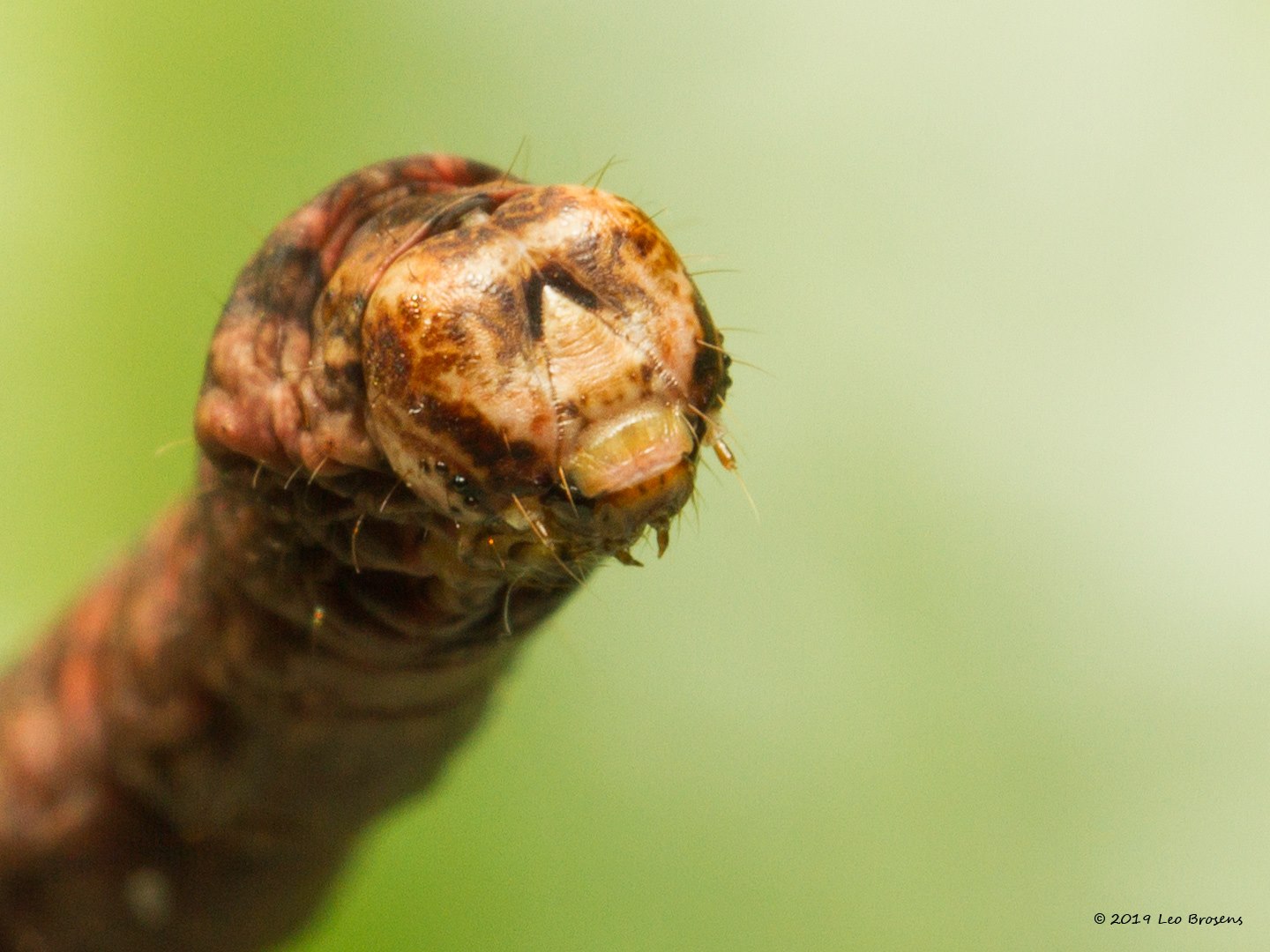 Het staat al in zijn naam; deze rups van deze nachtvlinder behoort tot een van de grootste families van de nachtvlinders 'de spanners'. Die naam is treffend gekozen omdat deze rupsen hun lijf steeds spannen als ze zich verplaatsen. Ze brengen dan steeds hun achterpoten naar hun voorpoten door hun rug te spannen, door een holle rug te maken. Daarna strekken ze hun rug weer en staan de voorpoten weer een stukje verder. Ze kunnen ook zoals hier die rug spannen om op een stukje tak te lijken, dat lukt hun vaak verrassend goed, de vijand merkt ze dan echt niet meer op. Deze rups vond ik ooit begin september op onze bank achter in de tuin onder de notenboom.