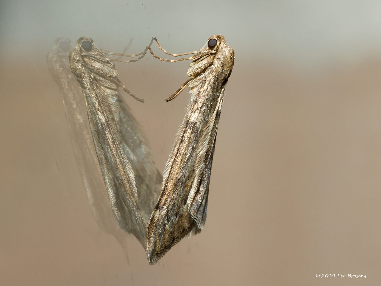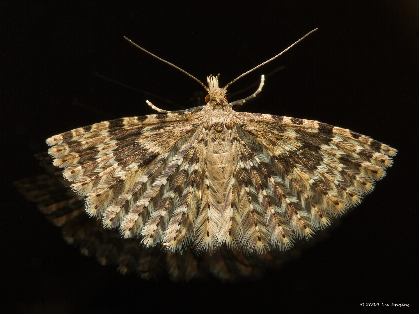 Nog eenmaal een vedermotje. Deze windevedermot landde in het donker bij onze buitenlamp. Op de muur fotografeerde ik hem en daarbij vloog ie op en vloog ie naar binnen in ons portaaltje. Daar op het stuckwerk maakte ik deze foto's. Heel goed is te zien hoe iel deze beestjes gebouwd zijn. Als je de bevedering, de beharing, weg denkt dan houd je al helemaal niets over. Toch werkt alles, ook de spiertjes voor pootjes en vleugels. Ik wou dat mijn spiertjes net zo efficient waren als van deze insecten, dan had ik al heel wat olympische medailles gescoord denk ik. Nu moeten we de eer aan deze beestjes laten.