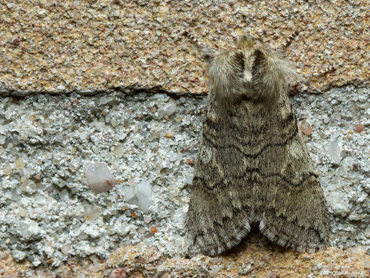 Deze dik aangeklede nachtvlinder heet 'kromzitter'. Dat terwijl hij gewoon normaal op de muur zit bij onze buitenlamp. Die naam heeft ie dan ook te danken aan zijn eerdere persoonlijkheid, aan de rups. Voelt de rups zich op zijn gemak dan zit ie namelijk steeds met het achterlijf gekromd omhoog gehouden, vandaar dus. De kromzitter vliegt maar goed een dikke maand, zo rond oktober en november. Dan komt ie bij ons best veel voor. Onze streek is wel de grens van zijn verspreidingsgebied, heel algemeen in het oosten van ons land, zo goed als niet voor komend in het westen. Dus wel in richting Tilburg en niet meer in richting Roosendaal.
