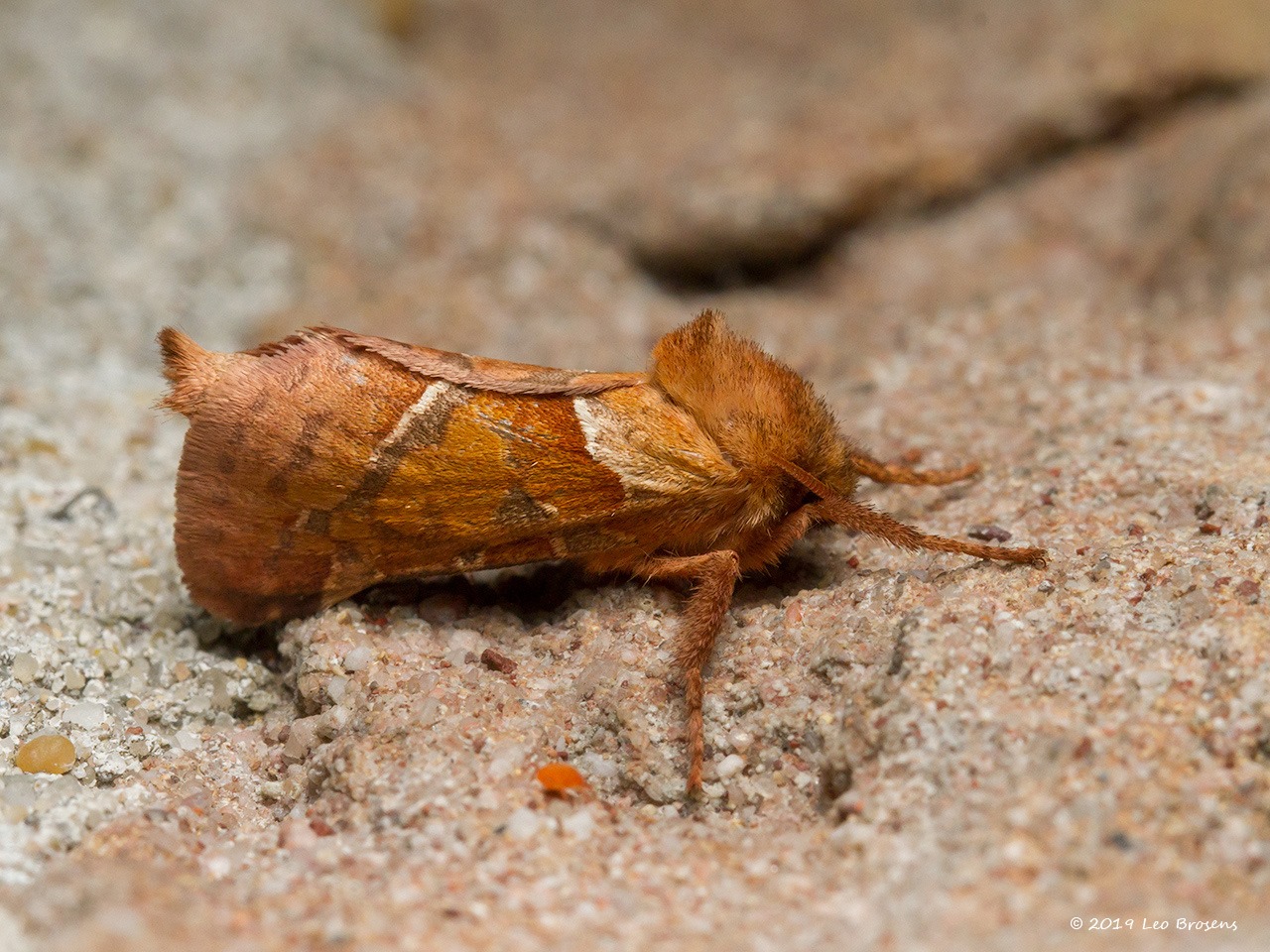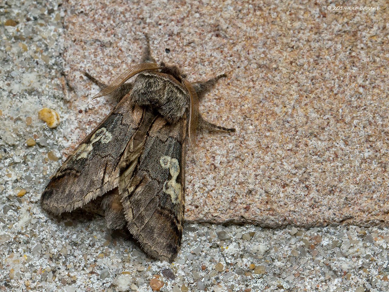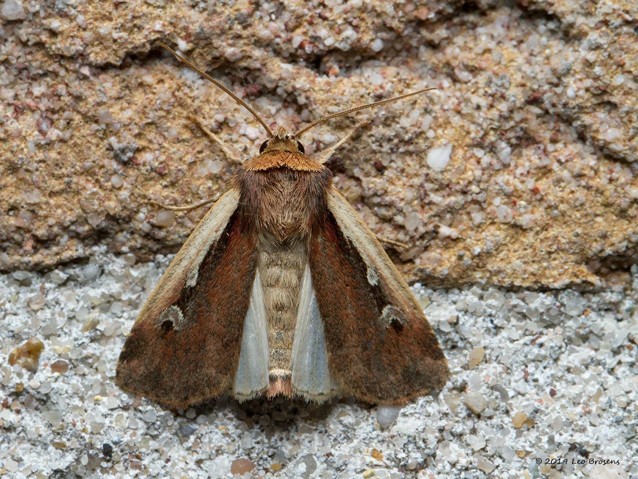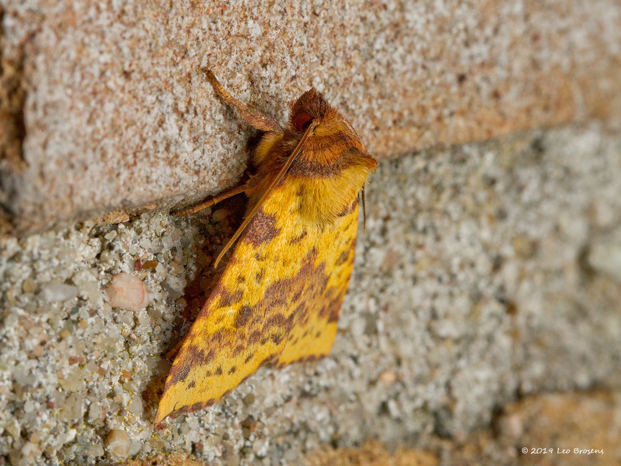 Nog een of twee weken en dan tref je deze mot niet meer aan, de vliegtijd is immers van half juli tot half oktober. Deze mooie nachtvlinder wil best op licht afkomen. Zo kwam deze op de muur bij onze buitenlamp zitten, de voegen zijn een goede referentie voor de grootte van de mot. Ze komen als het donker is, ik heb dus moeten flitsen om hem op de plaat te zetten. Door het heldere flitslicht wordt de mot eerder mooier, levendiger van kleur, dan onder normale licht omstandigheden denk ik. Op de mooie en leerzame site van de Vlinderstichting is meer te lezen over deze uil (Noctuidae). Zoals; de rups boort zich een weg in de onderste delen van de stengel van de waardplant, waar ook de verpopping plaatsvindt. De soort overwintert als ei.