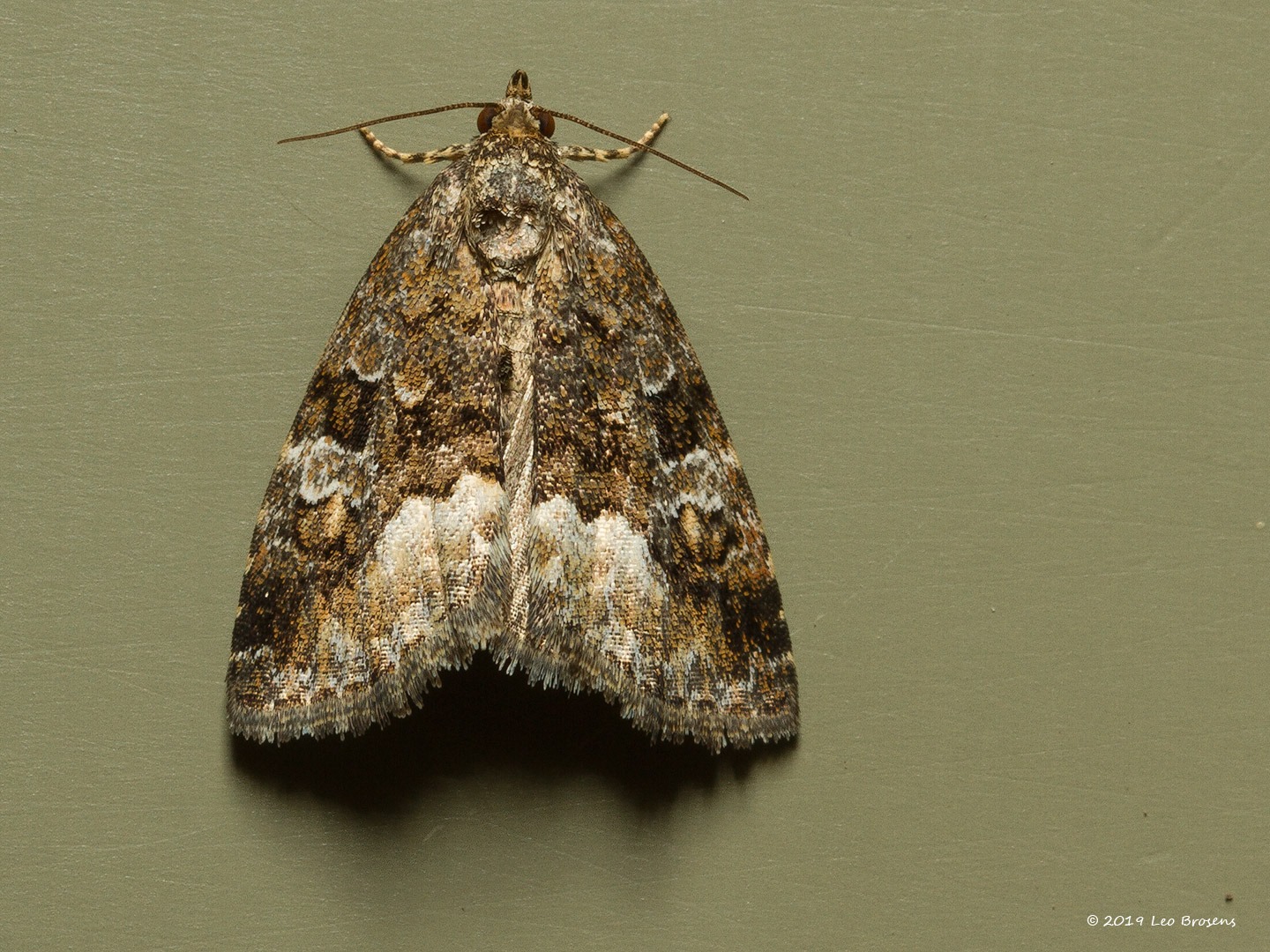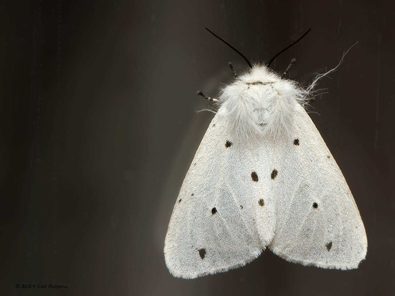 Een nachtvlinder herkennen, op naam brengen, is vaak best moeilijk. Neem deze die momenteel rond vliegt. De toevoeging 'schild' in de naam, ik weet niet waar die op is gebaseerd. Hier is de vlinder even gaan rusten op ons raam en opent bij uitzondering de bovenvleugels een beetje wat bij het herkennen behulpzaam is. Het is een schilddrager en die wordt op internet als onderstaand omschreven. Enkele kenmerken zijn te herkennen, anderen weer niet direct. Kenmerken vlinder: Voorvleugellengte: 17-20 mm. De voorvleugel is, vooral bij het vrouwtje, vrij breed en heeft een afgeronde vleugelpunt. De kleur is grijsachtig crèmewit met een fijne, grauwe tot zwarte spikkeling. De lichte ringvlek is meestal goed te onderscheiden, de niervlek is onopvallend; aan de buitenzijde van de niervlek ligt vaak een iets lichter gekleurd veld. Sommige exemplaren hebben een vrijwel geheel zwartachtige voorvleugel met vaak een extra opvallende, licht omrande ringvlek. De achtervleugel is witachtig bij het mannetje en grijsachtig bij het vrouwtje; langs de achterrand ligt soms een onduidelijke grijze band.