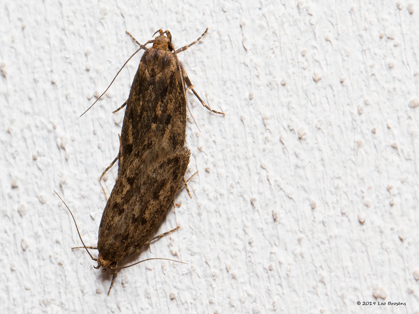 Nog een keer een ander scherphoekvedermotje. Nu van achteren gespot zittend op de vensterbanktegels, een voeg tussen de tegels is nog te zien. Van voor benaderd laten ze zich minder makkelijk op de sensor zetten. Zo in deze pose is goed te zien hoe lang wel niet die poten zijn. Voor welk doel zo lang vraag ik me af. Ook is de slijtage aan vleugeltjes te zien.