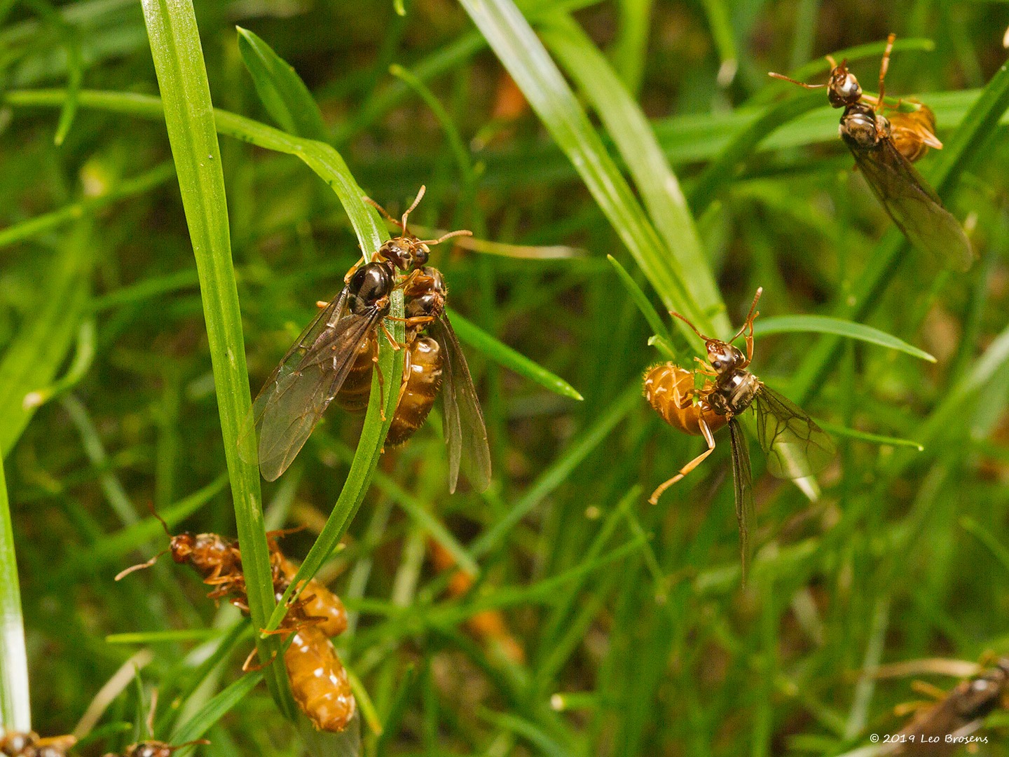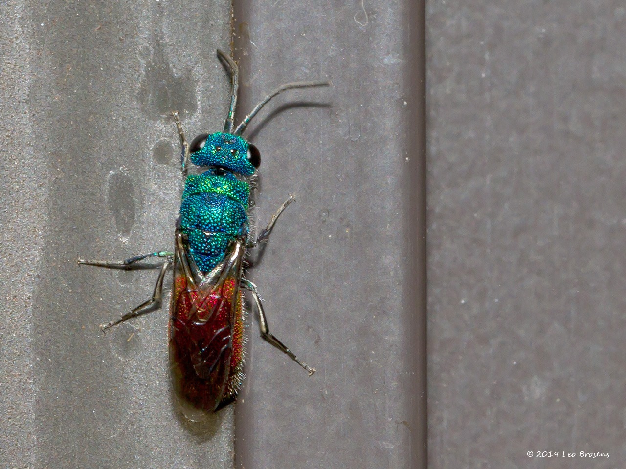 Een van de mooiste vliesvleugeligen vind ik de goudwespen. De metaalachtige blauwe, groene of rode kleur van het pantser vind ik bijzonder. Ik zie ze heel weinig in onze tuin. Een keer op onze achterdeur waarbij het slot nader werd onderzocht. Ik denk dat het kleine wespje wilde weten of het sleutelgat wellicht door een ander insect als broedplaats werd gebruikt. De goudwesp is namelijk een parasiet. De eieren worden afgezet in nesten van solitaire bijen en wespen en komen direct uit. Vervolgens beginnen de larven te eten van de voedselvoorraad en de larven van hun gastheer. Ze komen wereldwijd voor en kunnen echt klein zijn, van 0,2 tot 2 cm groot. Mocht je in de tuin een insectenhotel of iets dergelijks hebben dan moet je deze maanden daar goed opletten. Ze willen daar namelijk nogal eens een geschikt slachtoffer vinden om hun parasietengedrag in praktijk te brengen.