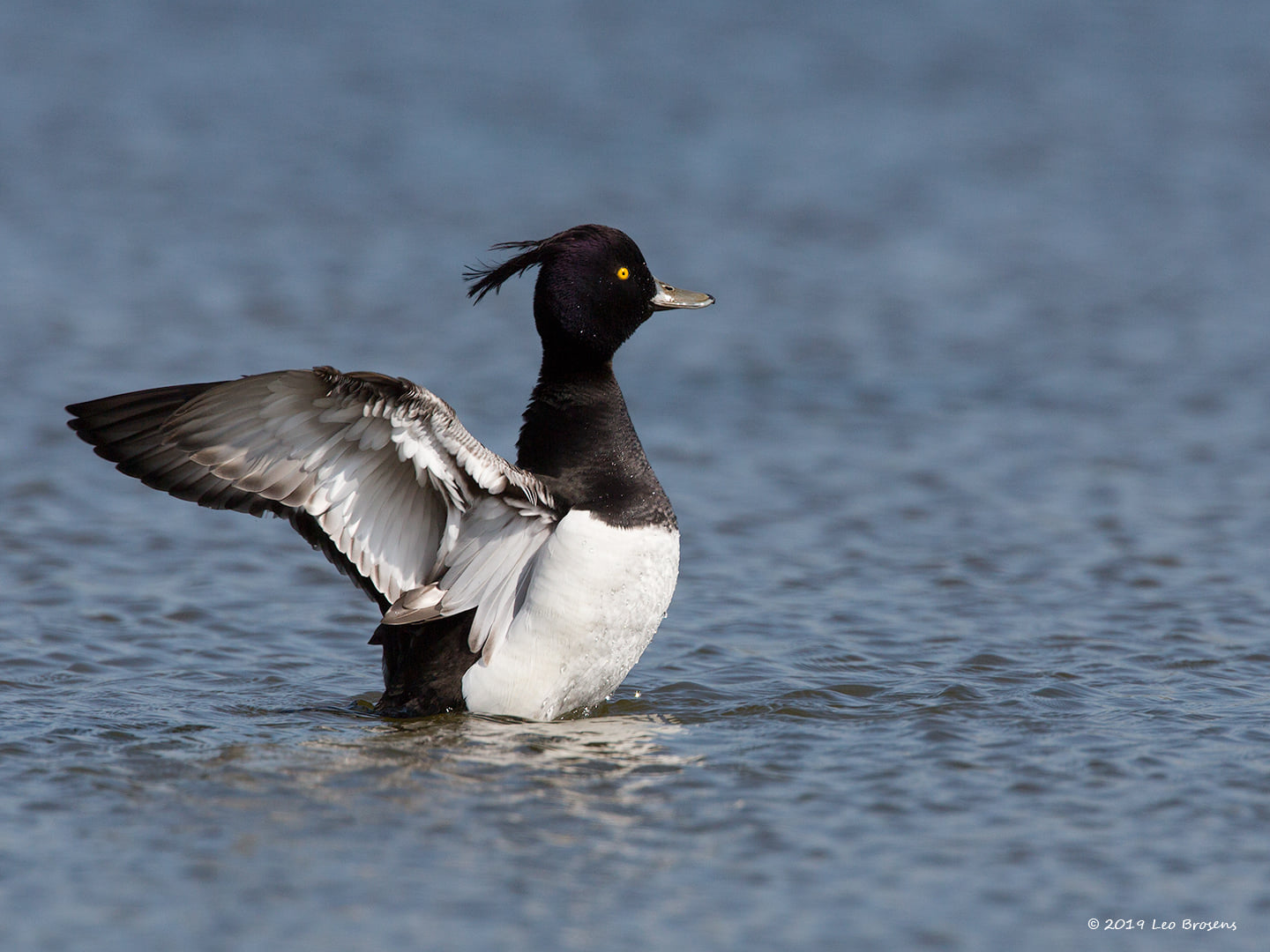 Heel anders dan het vrouwtje, veel mooier. Zwart-wit ziet meneer er uit maar onder goed licht zie je verschillende blauwe en paarse kleuren in het zwart. Het knalgele oog steekt sterk af. En, het kuifje is hier te zien. Een mooie eend die we gelukkig vaak zien in ons buitengebied. Een aanwinst daar zou ik zeggen. Niet al te groot is ie, van snavel tot staart ca. 45 cm, spreid ie de vleugels dan meet je ca. 70 cm.