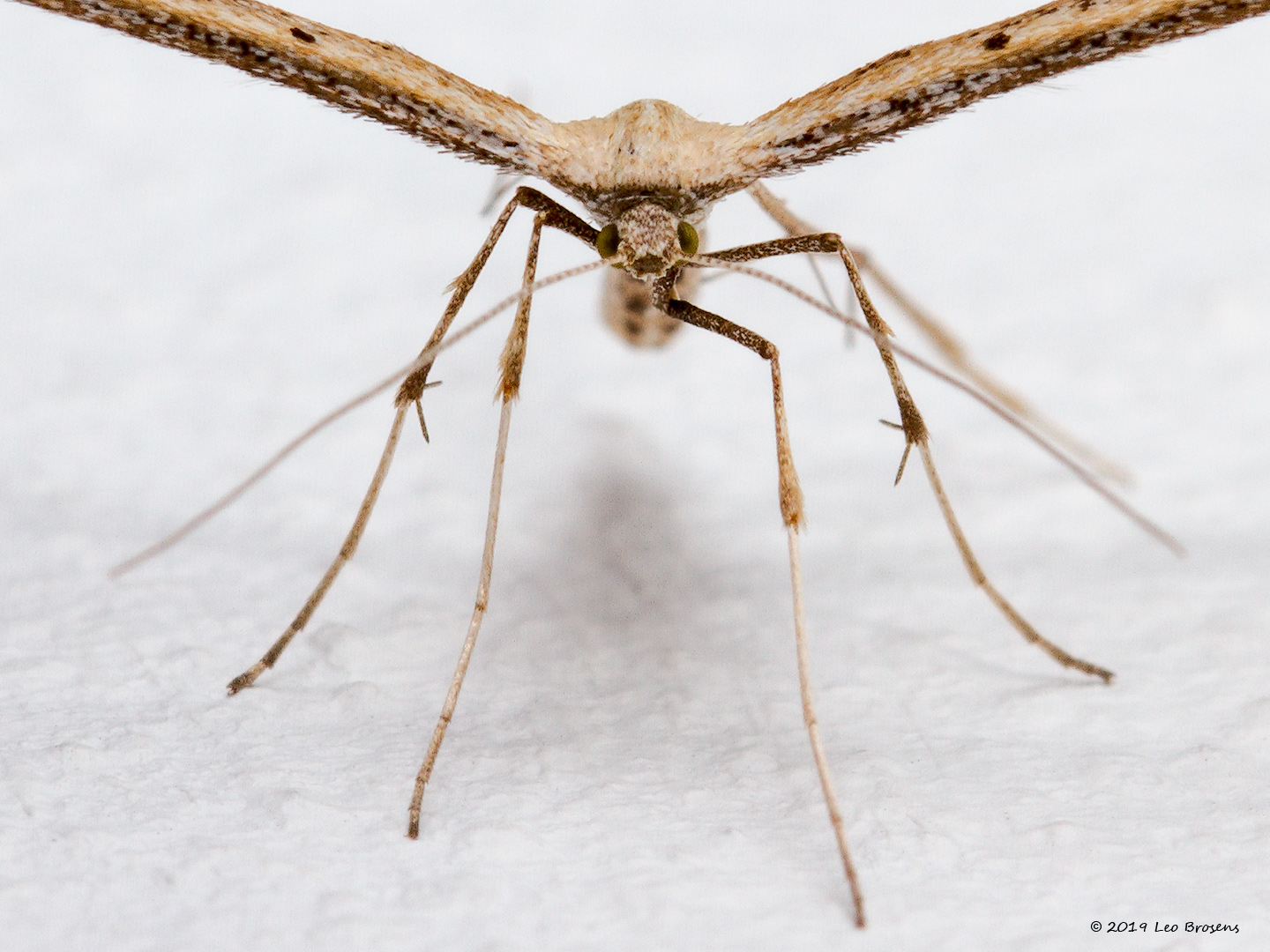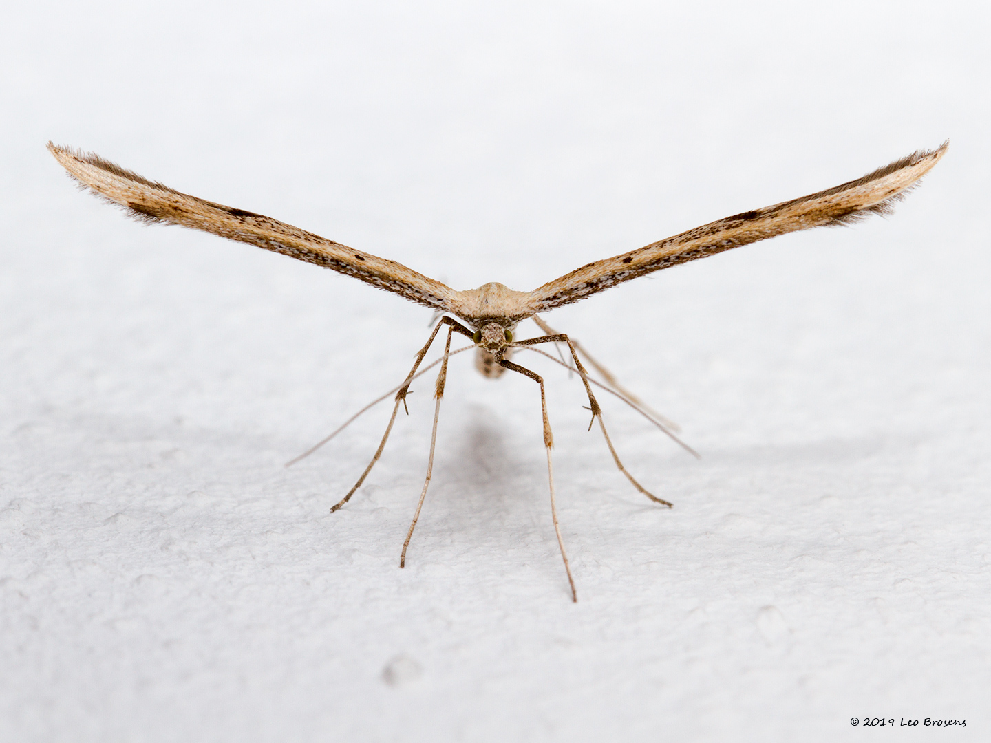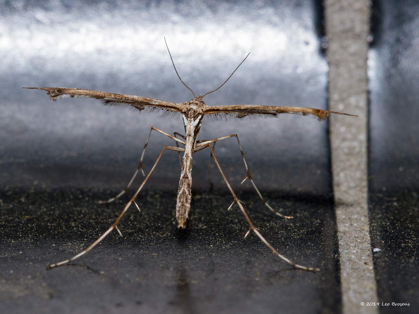 Iedereen kent wel onze dagvlinders. Een aantal kennen ook wel enkele nachtvlinders. Maar nog veel minder mensen kennen de kleinere nachtvlinders, de micro motten. Daar zijn er toch wel ca. 1500 soorten van. Ook met bijzondere bouw, zoals deze vedermot. Deze vedermotten (Pterophoridae) zijn bijzondere motten qua vorm. Ze hebben een lang en slank lichaam, de poten zijn ook lang met opvallende vertakkingen en de vleugels zijn smal en vormen samen met het lichaam in rusthouding een T. Kenmerkend zijn hun diep gespleten vleugels waardoor drie onderdelen ontstaan elk met een brede franje. Het zijn nachtvliegers, de vliegperiode is van juni tot september, deze foto nam ik op 16 september op het trespa boven aan de keukenuitbouw. Waardplant is vooral munt, salie, ogentroost. De spanwijdte van de vlinder bedraagt tussen de 17 en 23 millimeter. De soort overwintert als imago.