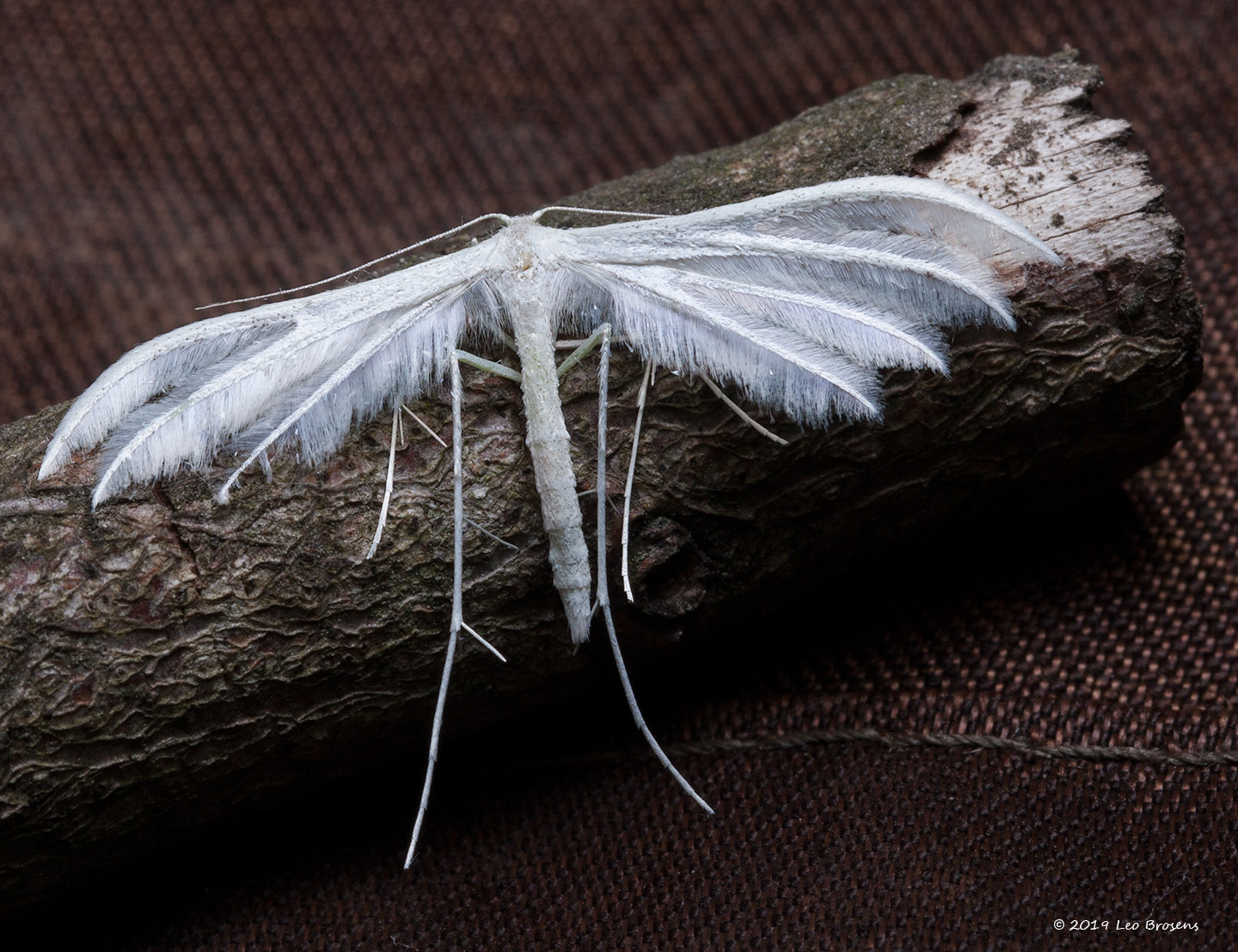 Tot nu heb ik een drietal vedermotjes gevonden in onze tuin. Daarbij dit geheel witte, sneeuwwitte, exemplaar. Gemakkelijk in de gidsjes terug te vinden deze keer. Hier kon ik het motje op een stukje tak laten zitten. Deze soort heeft nogal eens de vleugels niet geheel gesloten en daardoor is, als je goed kijkt, te zien hoe dit vliegtuigje eigenlijk is gebouwd. We zien de gewone boven- en ondervleugel. Echter van beide vleugels zijn alleen de buitenste randen nog bestaand en die zijn dan, zeg maar, enorm behaard. Door goed fladderen daarmee kan toch best goed het luchtruim worden bereisd.