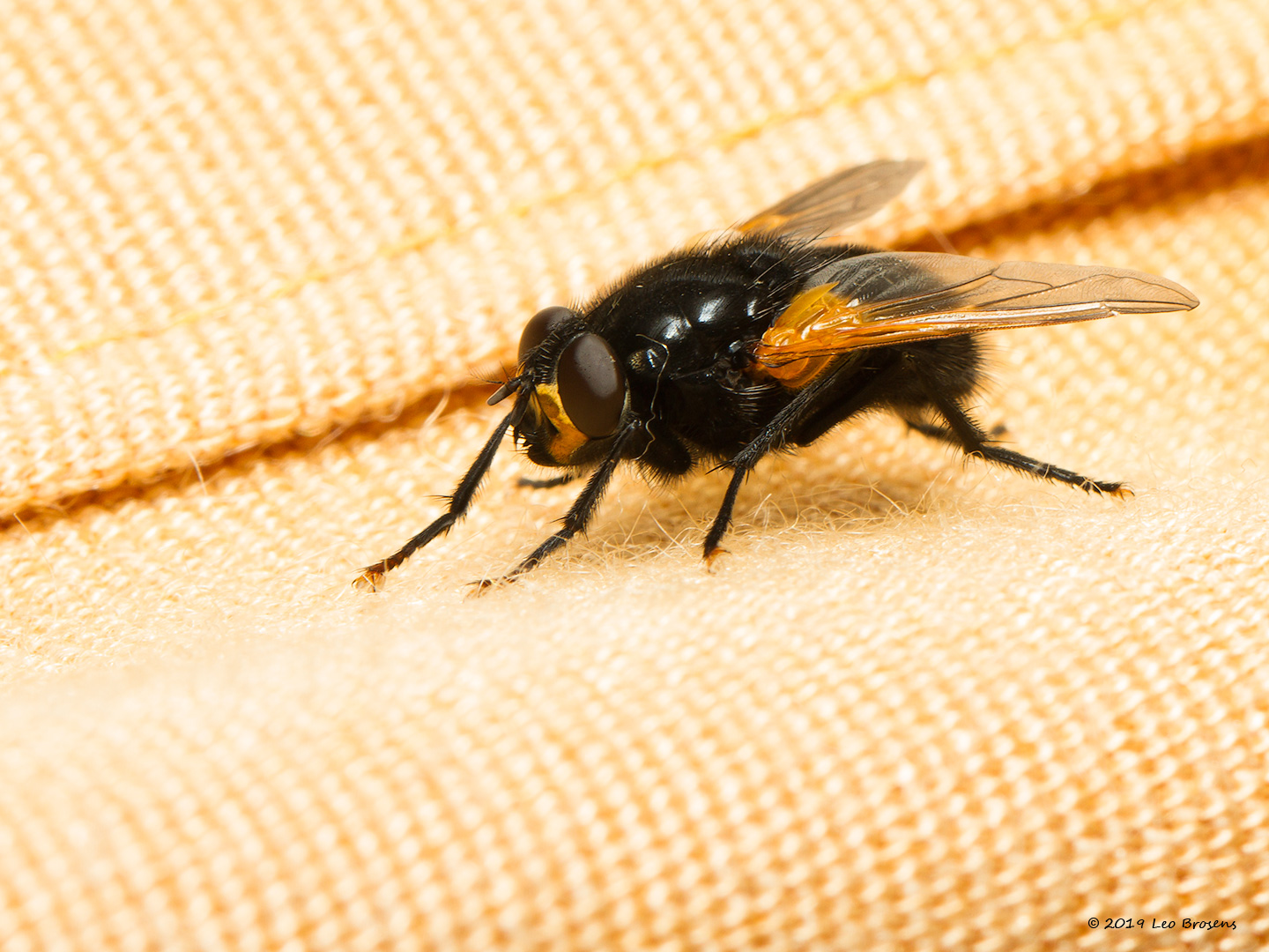 Er zijn een hele boel vliegen. Maar niet allemaal behoren ze tot de familie van de echte vliegen, de Muscidae. Deze schorsvlieg behoort tot de echte vliegen. Een mooie vind ik; vrij groot, glanzend zwart met opvallend goudgele vlekken tussen de ogen en oranje gekleurde vleugelbases en voeten. De schorsvlieg komt algemeen voor in Nederland en België. De vlieg is tussen eind april en eind oktober te zien. Je kunt hem nu dus tegen komen, vooral daar waar veel vee gehouden wordt. Ze houden van zonnen, op bomen of op de grond, vooral op zandgronden en bij bosranden. Het vrouwtje legt haar eitjes in paarden- en koeienmest. De larven uit de eitjes eten geen mest maar leven van de larven van andere insecten, zoals die van andere vliegensoorten, die zich in de mest bevinden.