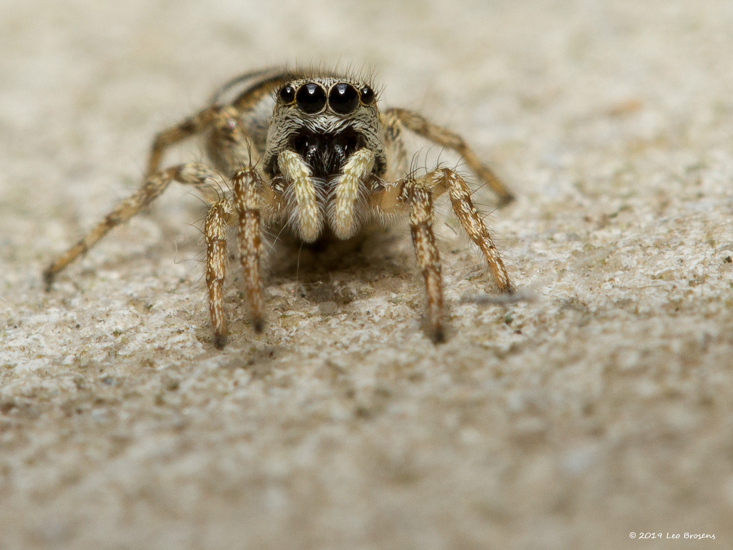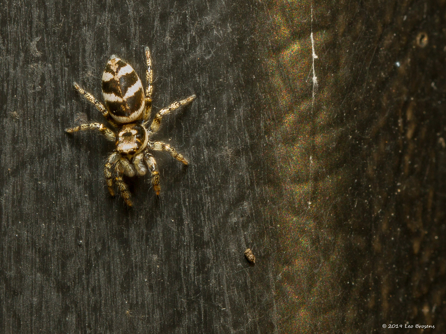 Een echt springspinnetje is dit. Slechts ca. 6 mm groot en vrij algemeen in onze streken. Je vind hem vaak op gebouwen zoals hier naar beneden lopend op een damwand van een schuurtje. Ze maken geen web maar bespringen hun prooitjes. Die speuren ze op vooral met de twee grote kijkers voor op het kopje. Daarnaast voor ook nog twee kleinere kijkglazen en helemaal opzij van de kop nog eens twee kleintjes. Die kleintjes zijn niet zo zeer voor de jacht maar houden de omgeving goed in de gaten. Er zijn wel 80 inheemse soorten springspinnetjes in ons land. Bijzonder bij hen is de manier hoe ze kijken, hoe ze hun beeld scherp stellen. Wij mensen maken onze ooglens meer en minder bol, de springspin laat de lens ongemoeid maar verzet achter die lens steeds het netvlies in alle richtingen waardoor ook scherp wordt gesteld.