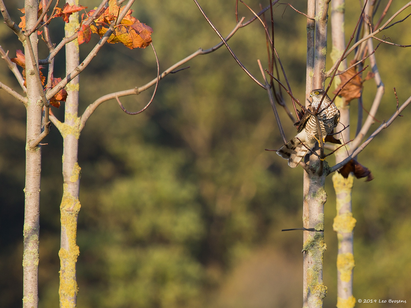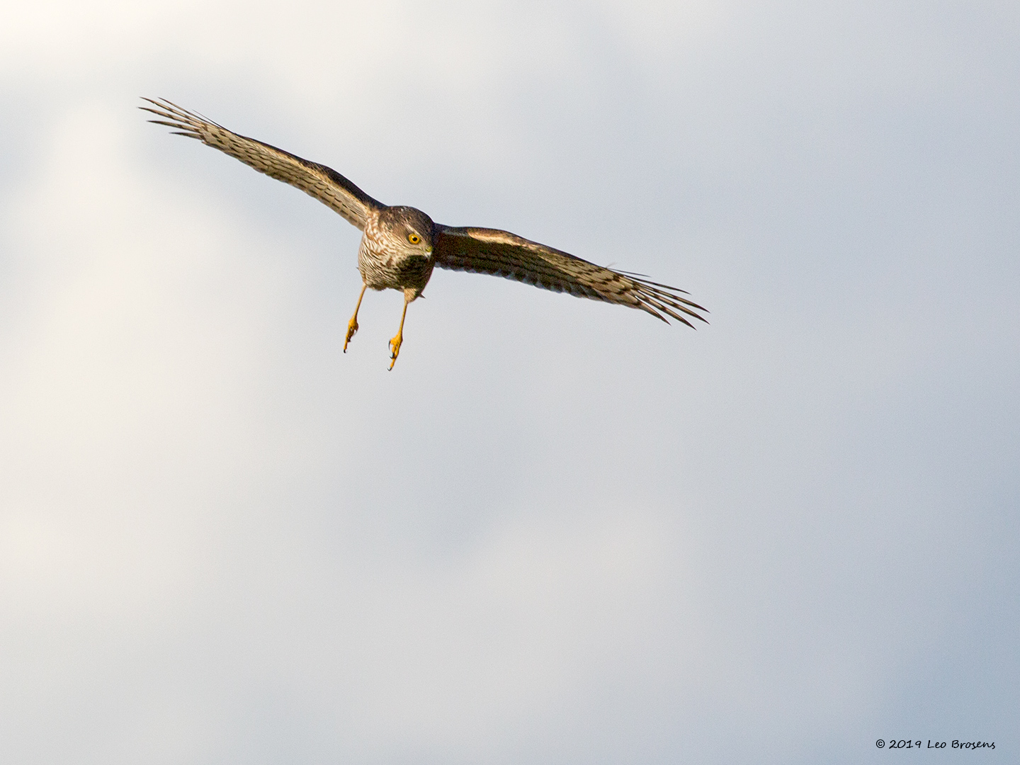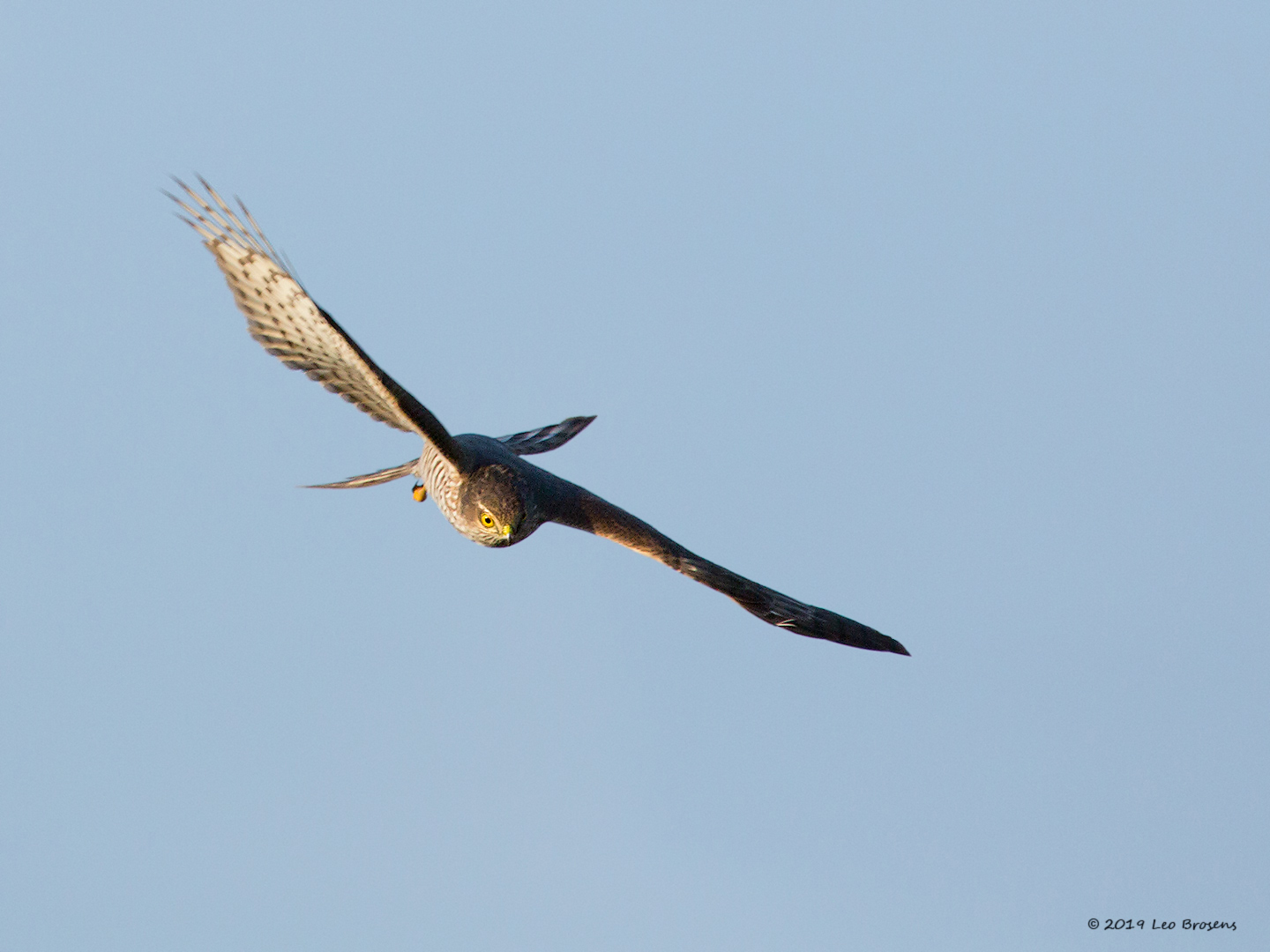 Bij een strook groenbemesting met allerlei planten daarin, kunnen vogels eten vinden. Deze plekken zijn in deze tijd erg belangrijk voor bijvoorbeeld vinken. Hele groepen komen er foerageren. En dat blijft niet onopgemerkt. Er zijn weer andere vogels die van die vinken willen profiteren. Zoals deze sperwer, die zag ik jagend boven de groenbemesting vliegen. Binnen een seconden kon ik enkele foto's maken. Daarop zijn verschillende jachthoudingen te zien. Eerst wat hoger voor het overzicht, dan wat lager al met aarzelend gestrekte grijpers en tenslotte in snelle vlucht verbluffend wendbaar door het gebruik van de grote stuurstaart. Steeds zijn de opvallend gele ogen strak gefocused op het struweel. Dat struweel is op zich een veilige haven voor de vinken, daarin worden ze niet snel bruikbaar opgemerkt, ik zag de sperwer deze keer geen prooi slaan.