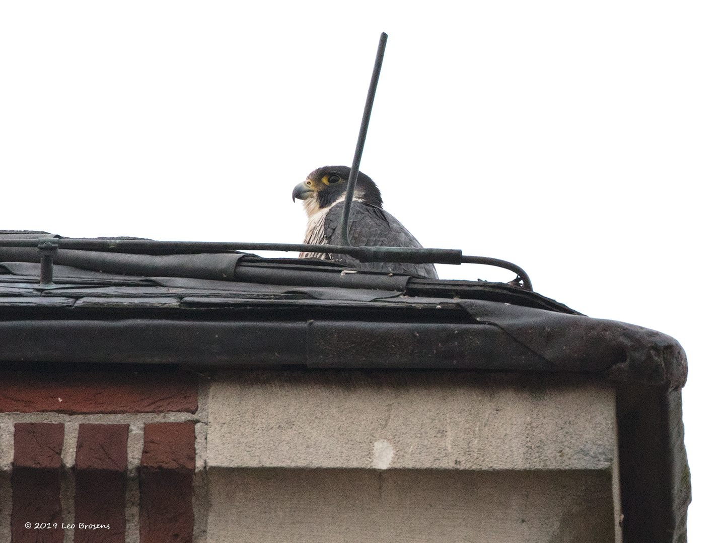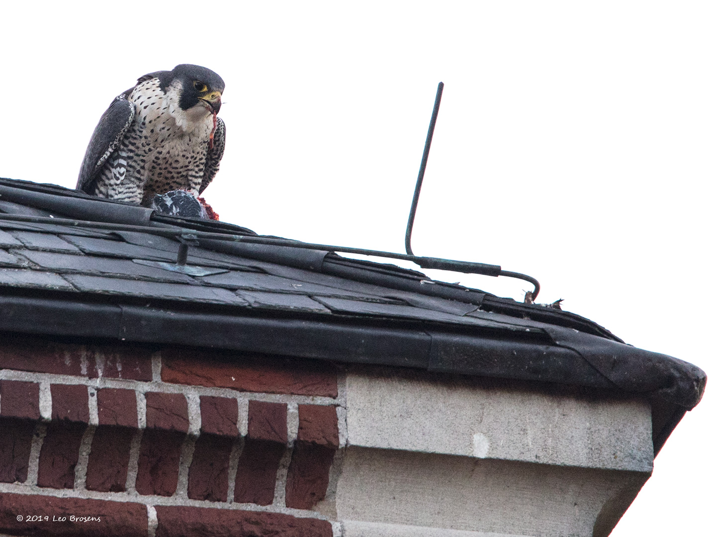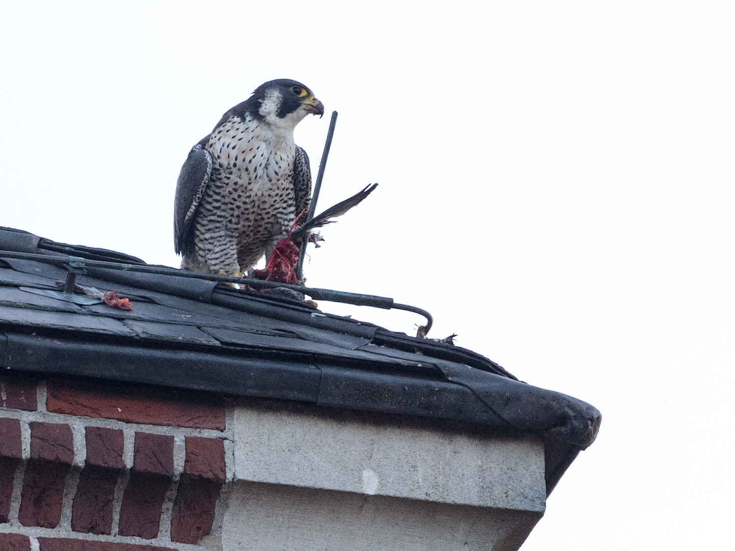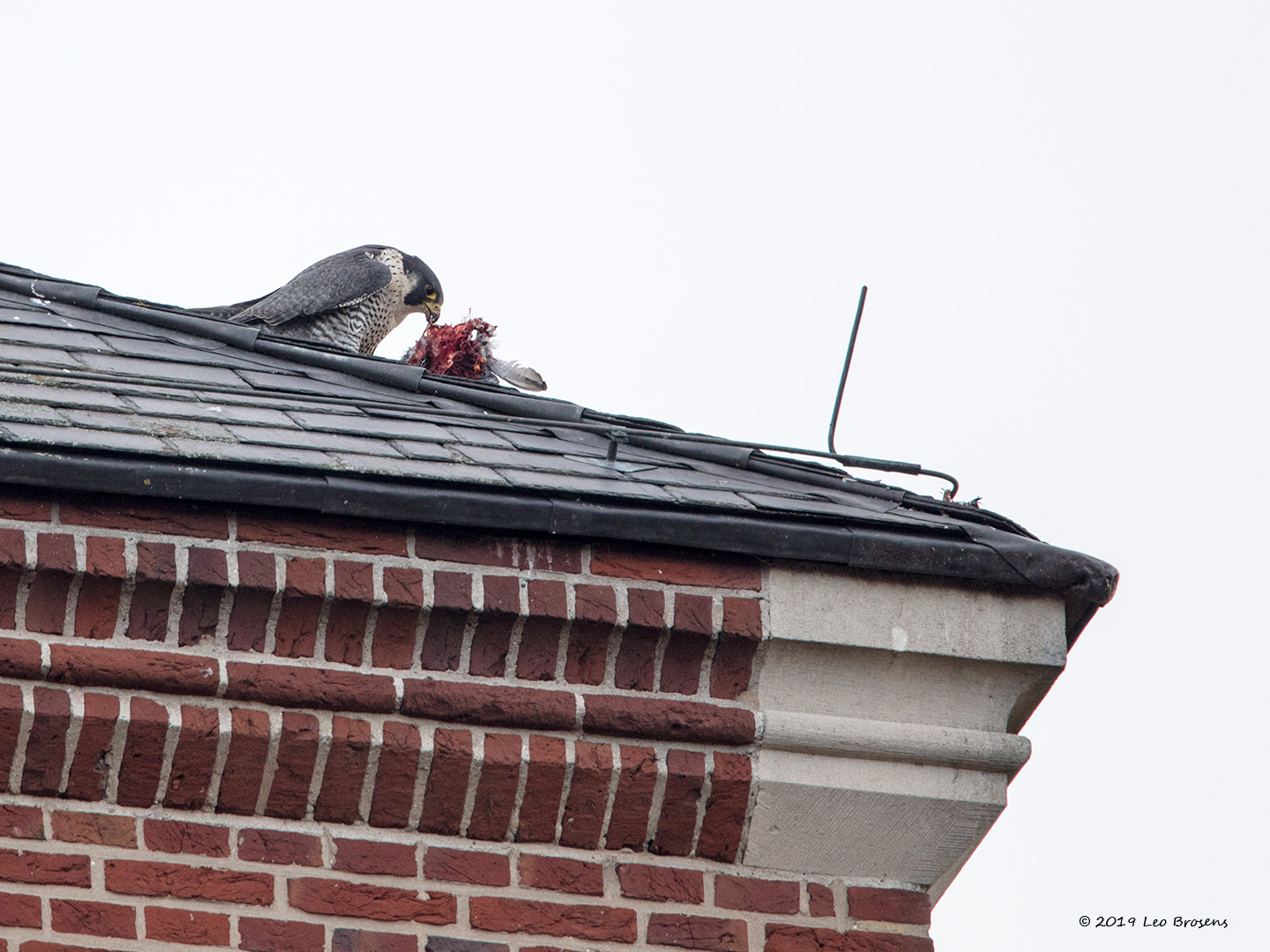 Van de Alphense natuurfotograaf Harrie Timmermans, die een fotoshow gaf bij de Vogelwerkgroep, leerde ik dat op de kerktoren van Alphen een slechtvalkenkast was geplaatst. Waarom niet een keer daar gaan kijken dacht ik. En wat een mazzel, er zat een vogel op de torenspits. Een goeie foto maken valt echter nog niet mee want de brute predator zat op ruim 80 meter van mijn lens af een duif op te eten. Eerst bijna geheel buiten beeld maar gelukkig ging ie nog naar een randje toe. Regelmatig zat een stukje van de bliksemafleider natuurlijk weer precies voor de vogel.