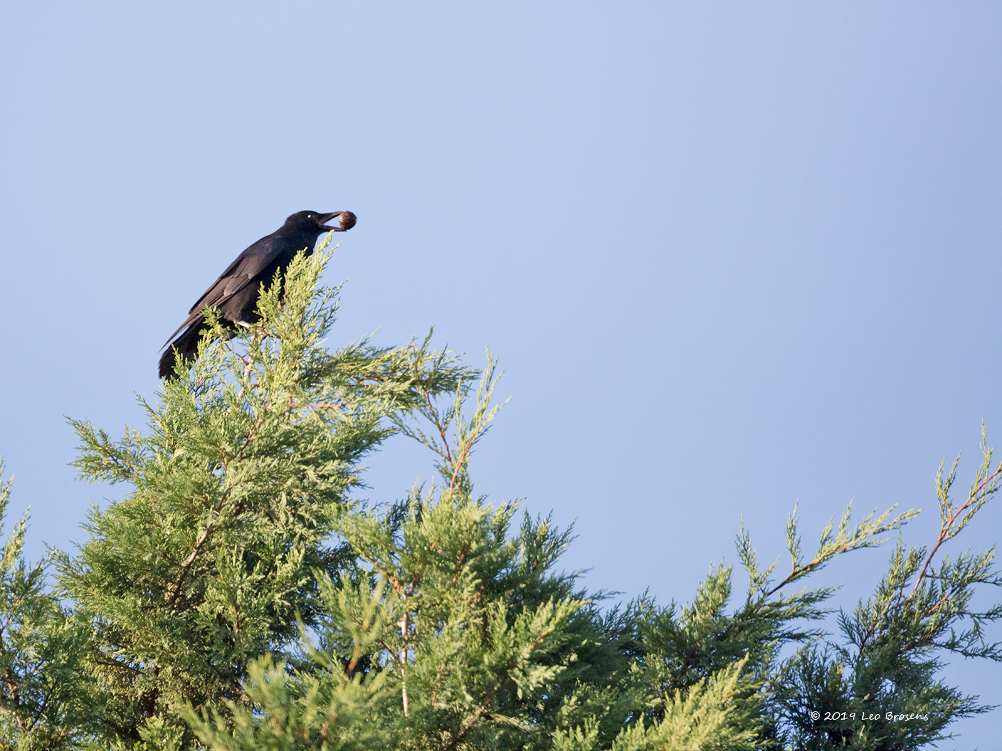 Notendieven zijn het, die paar kraaien die donders goed weten dat in onze tuin een flinke notenboom staat. Met regelmaat komen ze op bezoek om een noot te zoeken en mee te strietsen. Ze zijn erg op hun hoede en zijn zo gevlogen als ze merken dat ze worden gevolgd. Soms met als tussenstop de kruin van onze grote conifeer, zoals hier, wordt met de buit naar een meer afgelegen plek gevlogen om de noot te kraken.