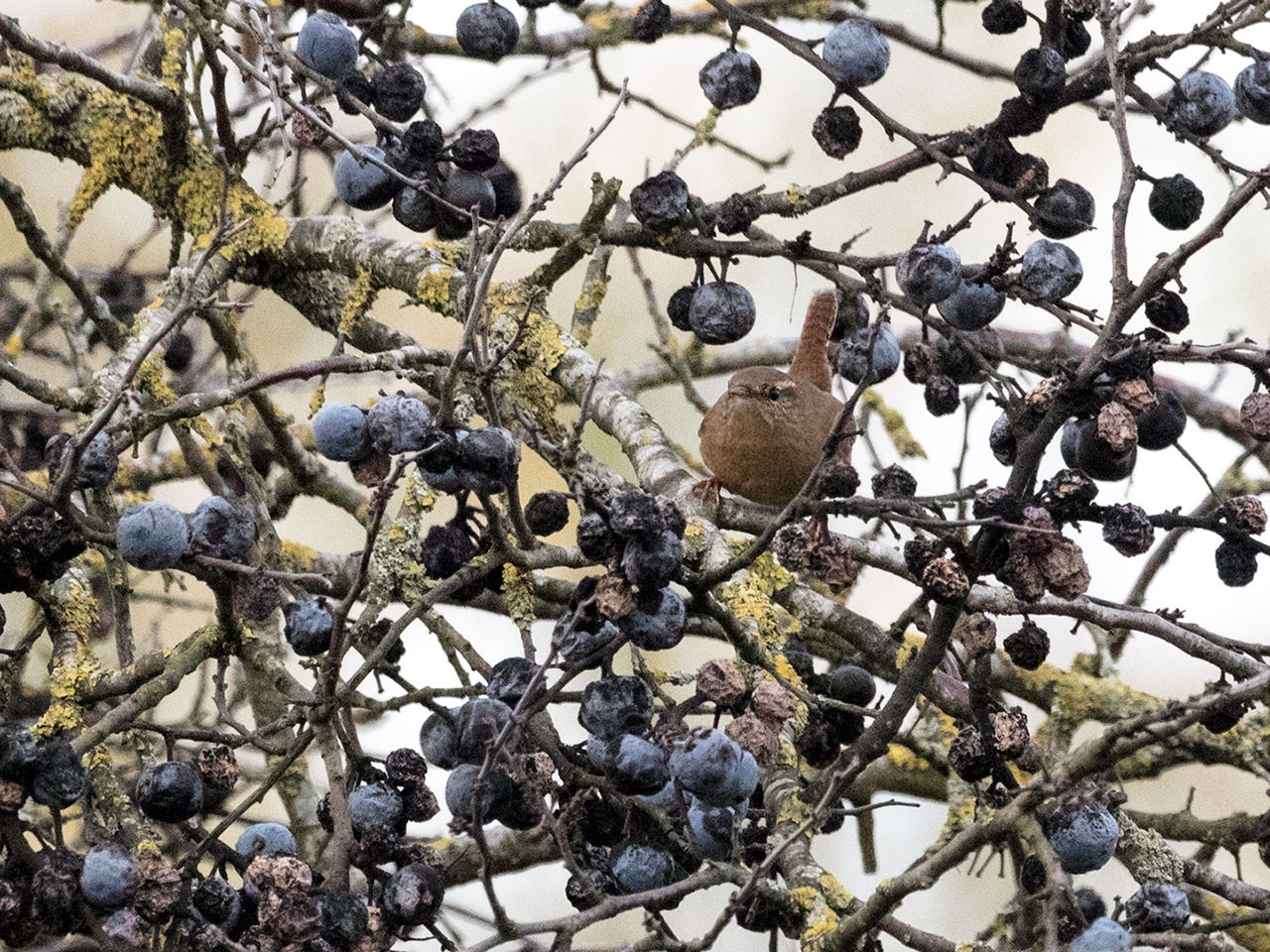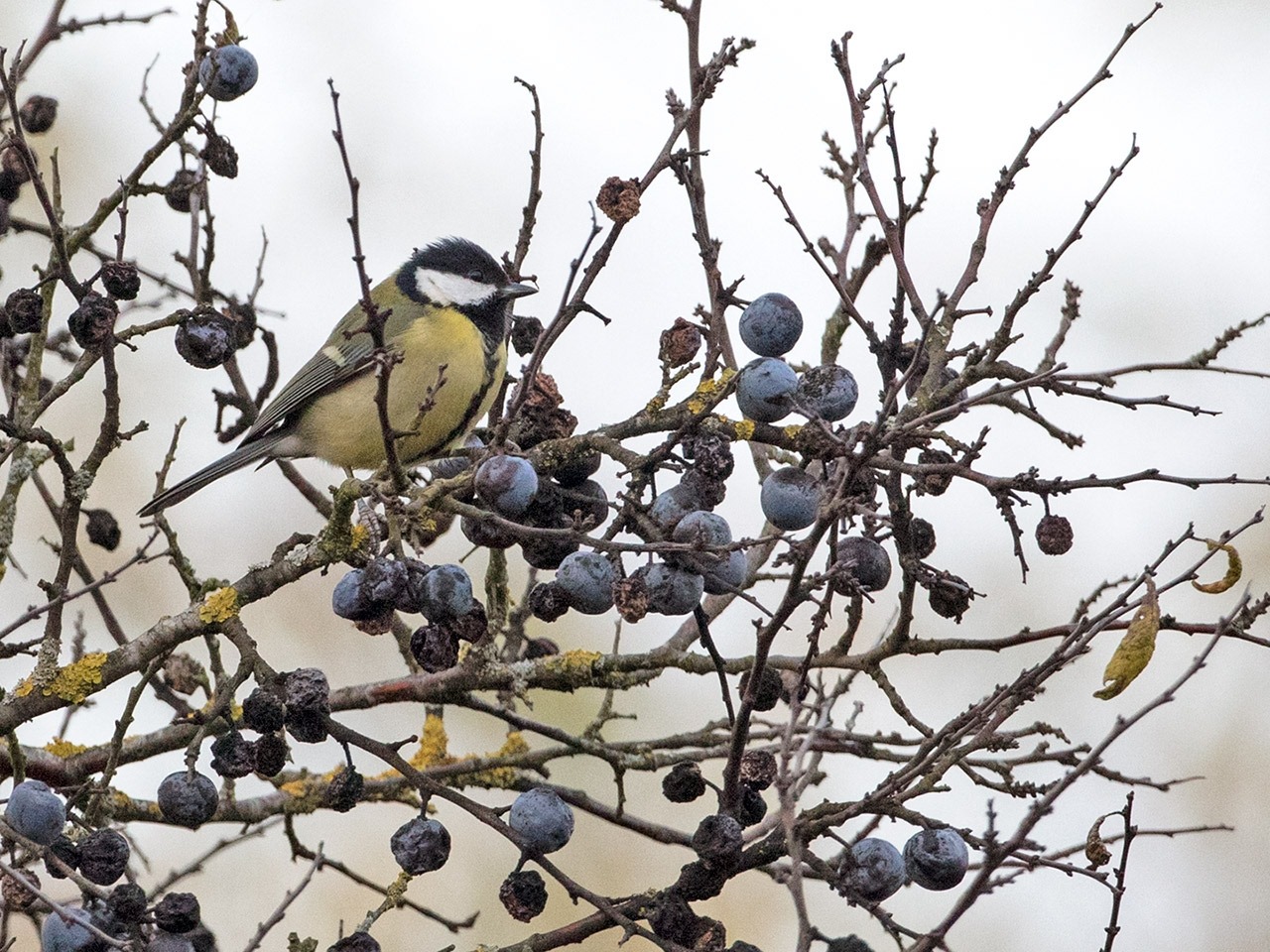 In Sprundel zag ik een flinke heg staan met nog steeds flink wat best grote blauwe bessen er aan. Waarom nog niet opgegeten moest ik denken. Nou, dat heeft een reden. Ik kende de struik niet maar ik denk nu dat het een sleedoorn is, de eerste aan het eind van de winter wit bloeiende struik in onze natuur. En die bessen, die blijken nu veel te hard en veel te wrang. De natuur heeft daar weer wel een oplossing voor want na flink wat vorst worden de bessen zachter en minder wrang. Dan pas worden ze gegeten, waarschijnlijk nog met wat tegenzin maar honger maakt alles lekker.