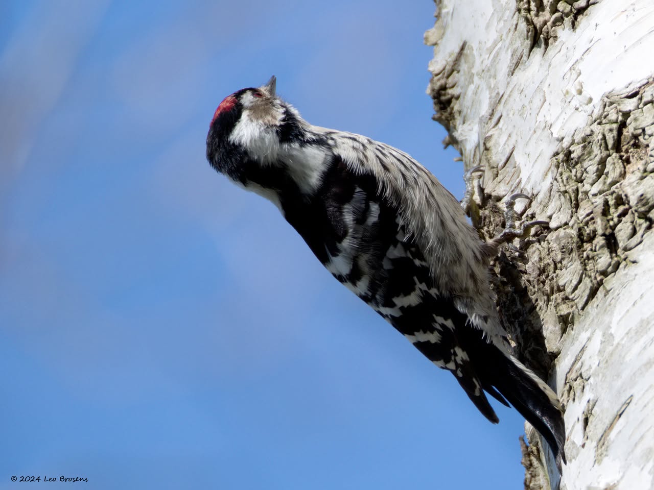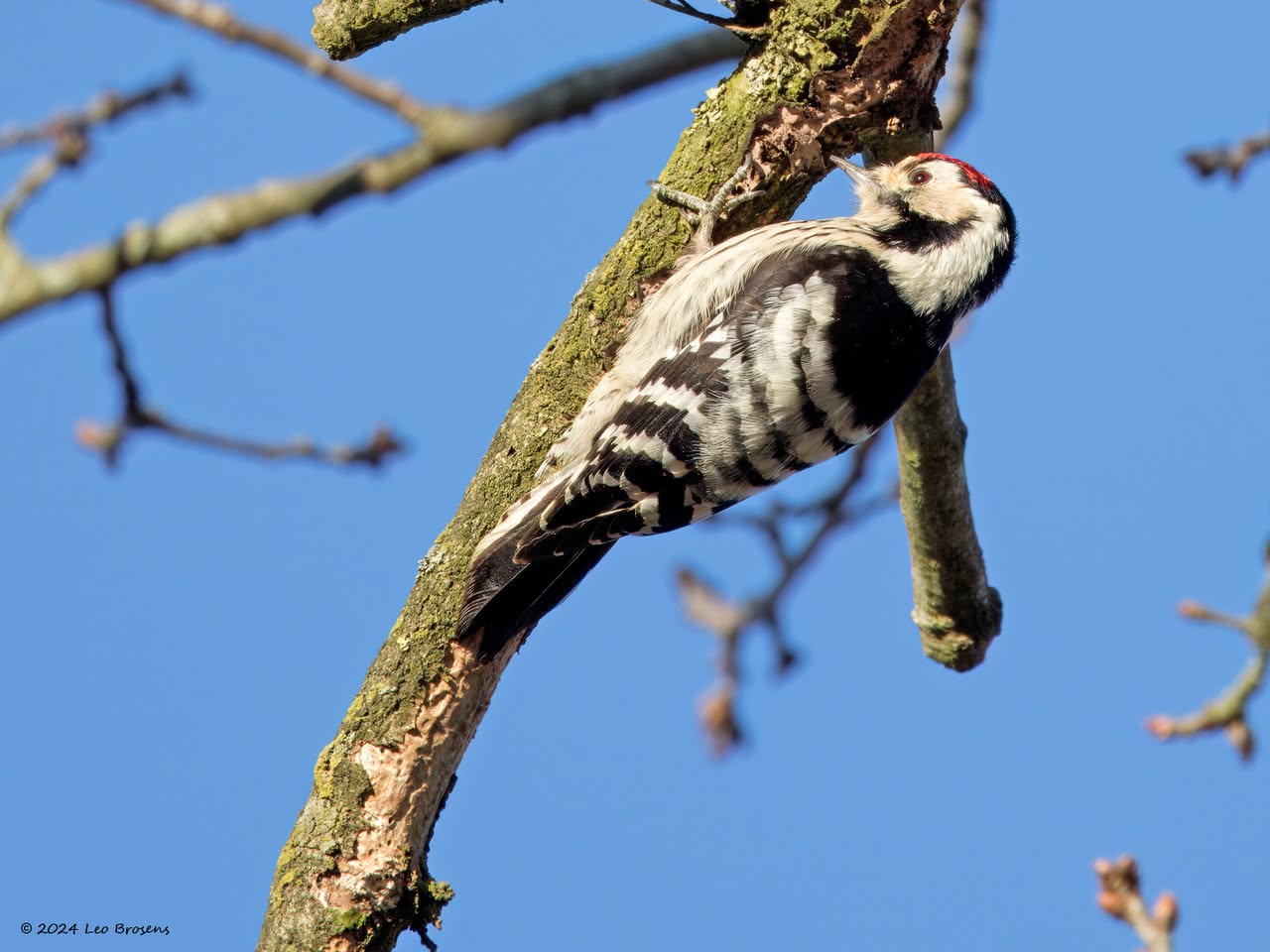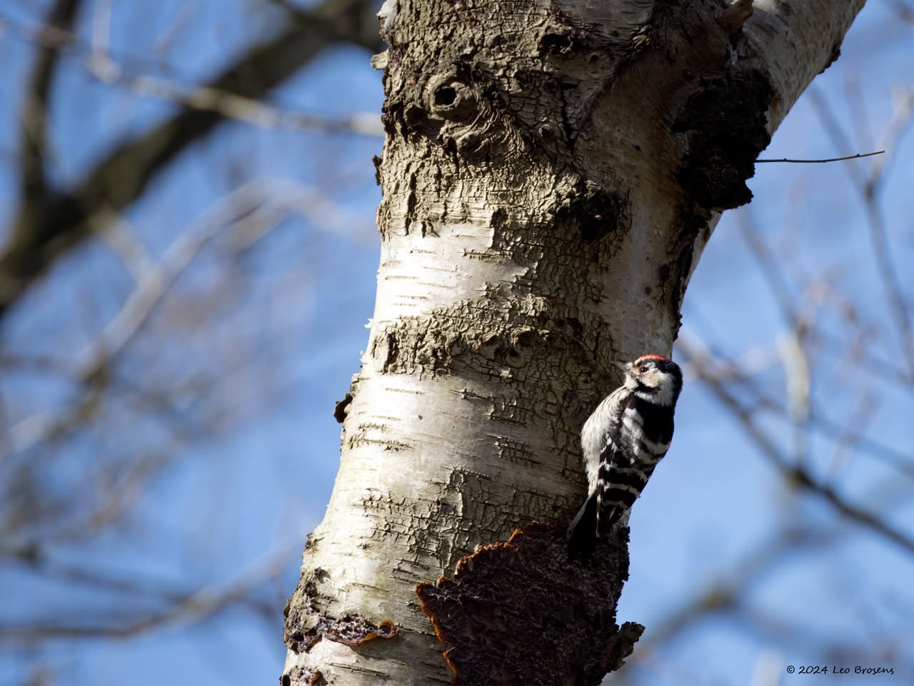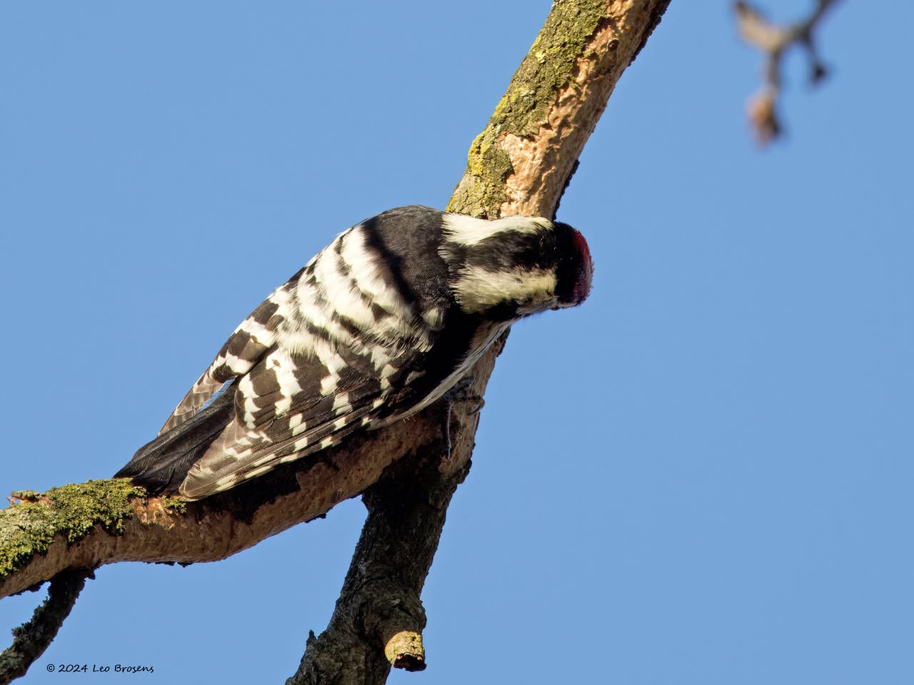 Precies een week geleden scheen de zon rond de middag, echt waar. Toen spotte ik deze kleine specht hoog in een boom in de Waaienberg. Klein betekent hier een lichaamslengte van 14 tot 16 cm, de vleugels geheel gespreid meet een spanwijdte van 25 tot 27 cm. De soort is duidelijk seksueel dimorf wat betreft de koptekening. Alleen het mannetje heeft een rode kruin, aan de zijkanten gebiesd met een zwarte streep. Het vrouwtje heeft een geheel zwarte kruin en is dus geheel zwart-wit gekleurd. De rugtekening is ook kenmerkend. Let op het steunstaartje.