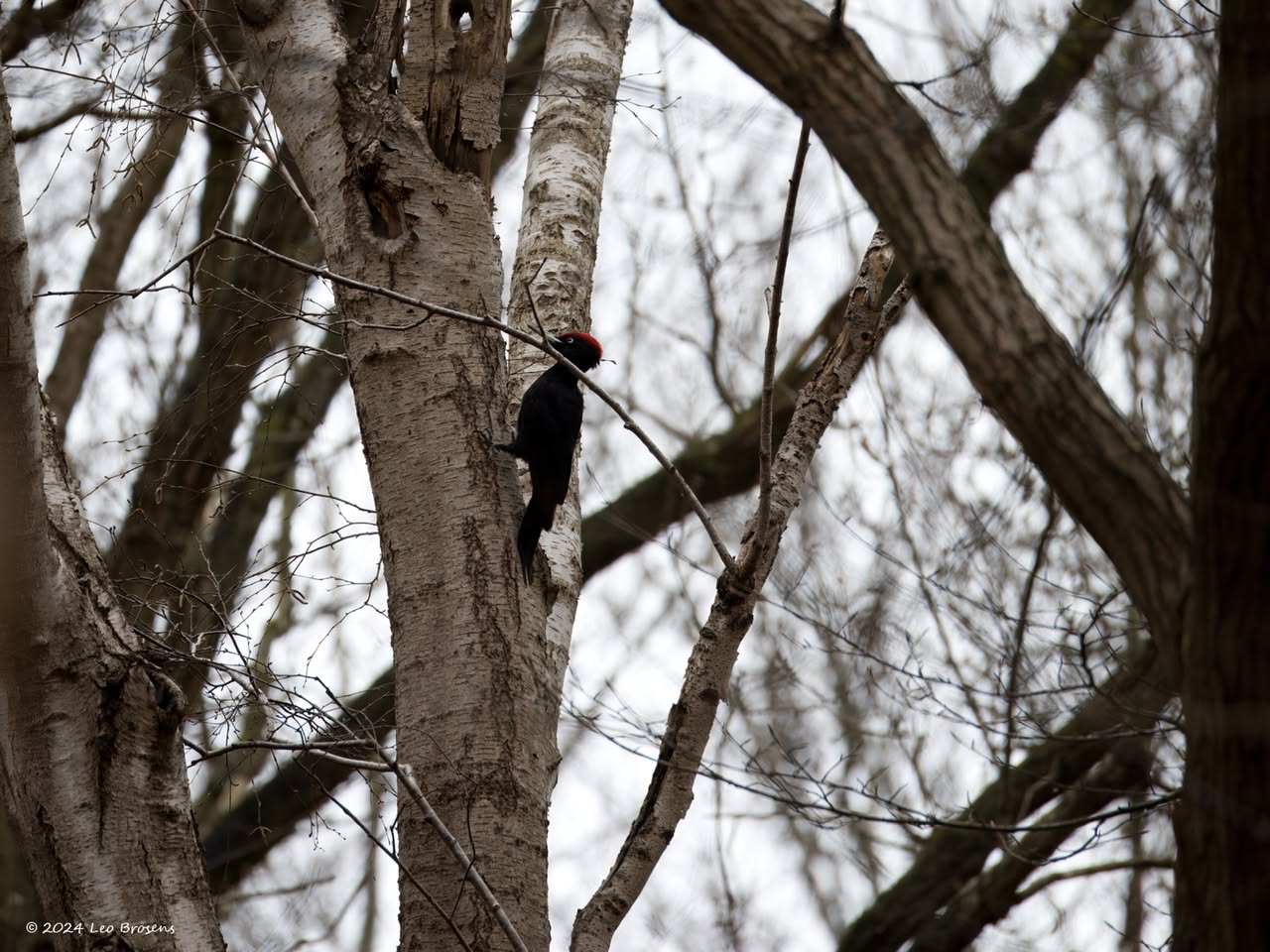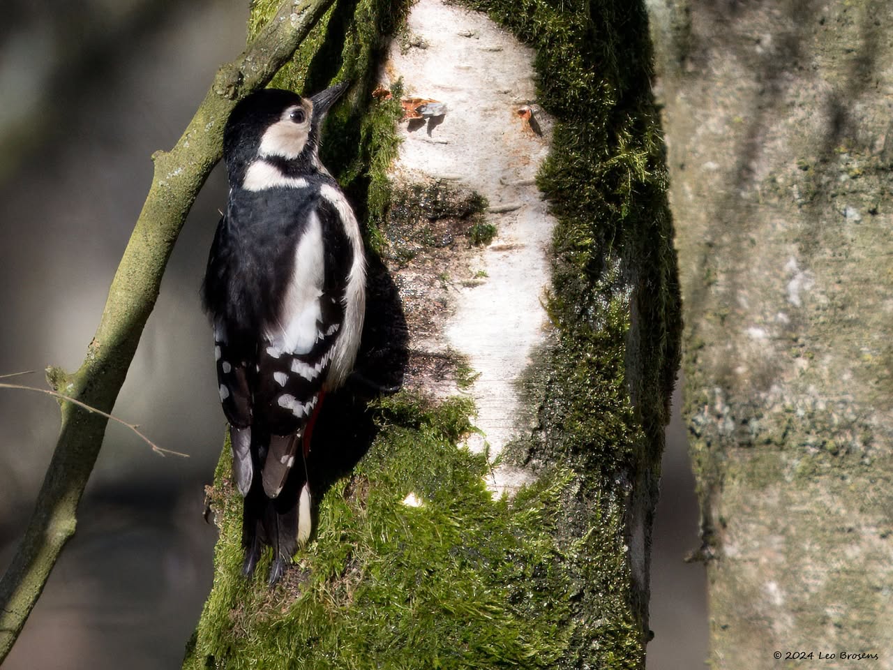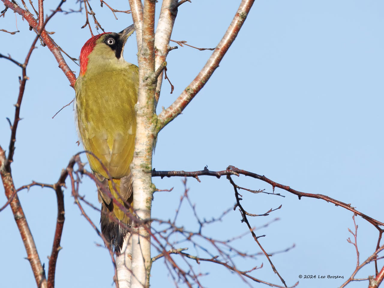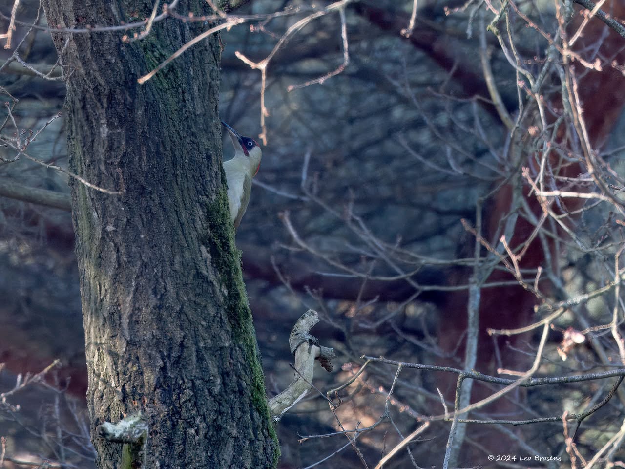 Precies een week geleden scheen de zon rond de middag, echt waar. Toen spotte ik deze kleine specht hoog in een boom in de Waaienberg. Klein betekent hier een lichaamslengte van 14 tot 16 cm, de vleugels geheel gespreid meet een spanwijdte van 25 tot 27 cm. De soort is duidelijk seksueel dimorf wat betreft de koptekening. Alleen het mannetje heeft een rode kruin, aan de zijkanten gebiesd met een zwarte streep. Het vrouwtje heeft een geheel zwarte kruin en is dus geheel zwart-wit gekleurd. De rugtekening is ook kenmerkend. Let op het steunstaartje.