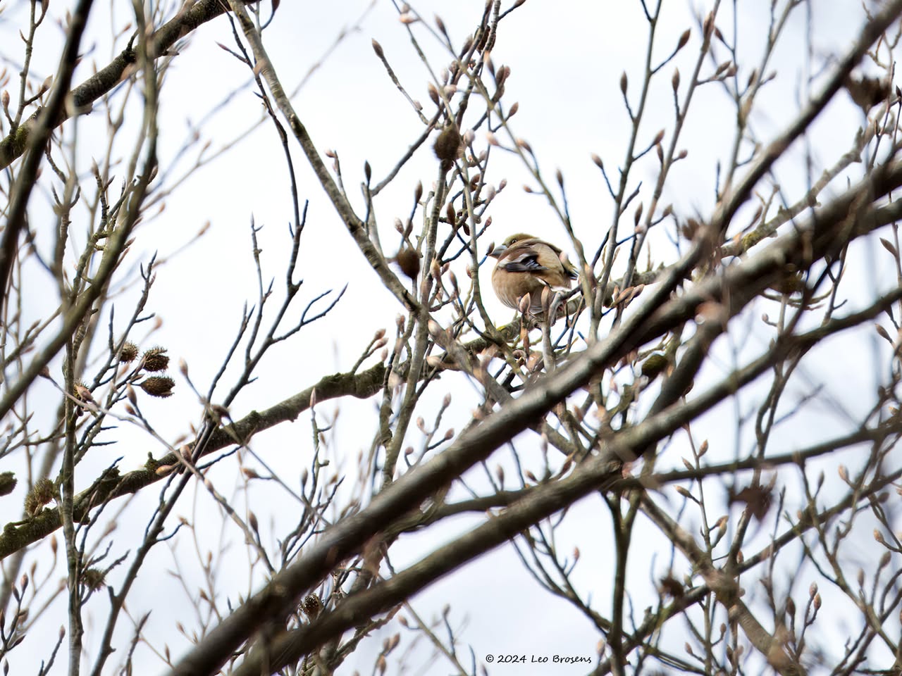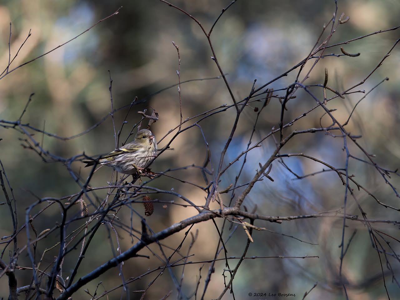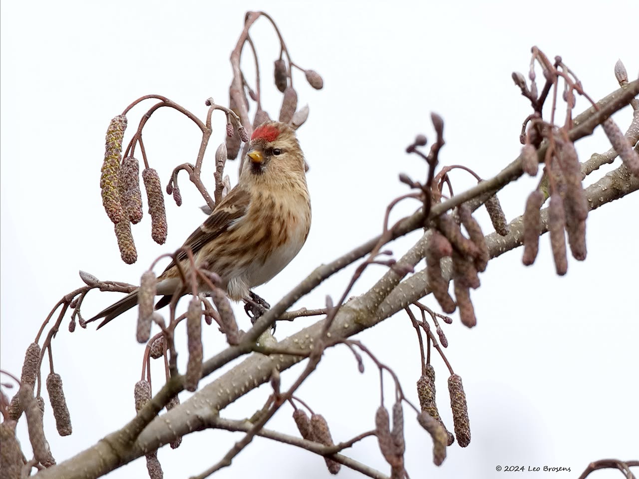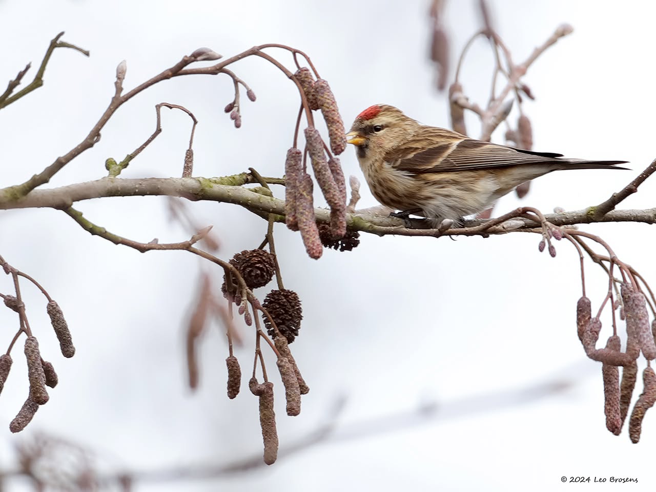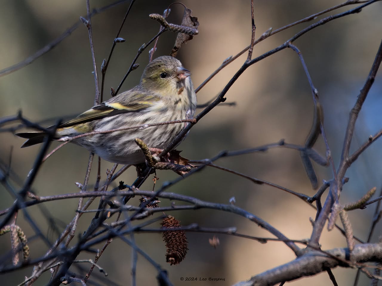 Gisteren liet ik het mannetje zien. Maar in het groepje dat ik tegen kwam zaten natuurlijk ook vrouwtjes, zoals dit. Het groepje nam er even rustig de tijd voor om wat berkenzaadjes te eten. Zaadjes genoeg, er wordt mee gemorst. Of zijn het slechts de schilletjes van de zaadjes die weer uit de snavel vallen na uitpeuteren van het feitelijke zaadje?