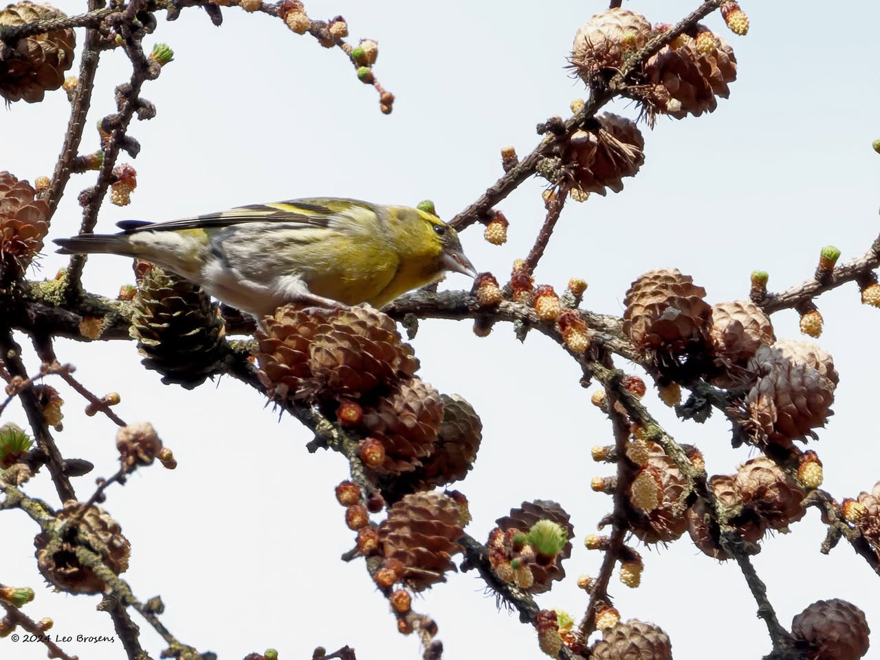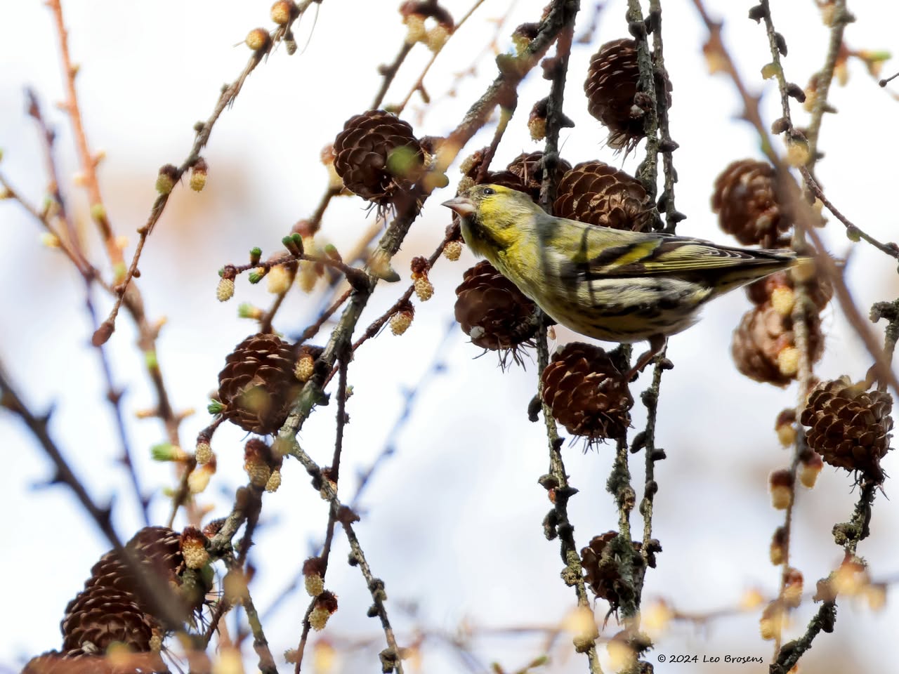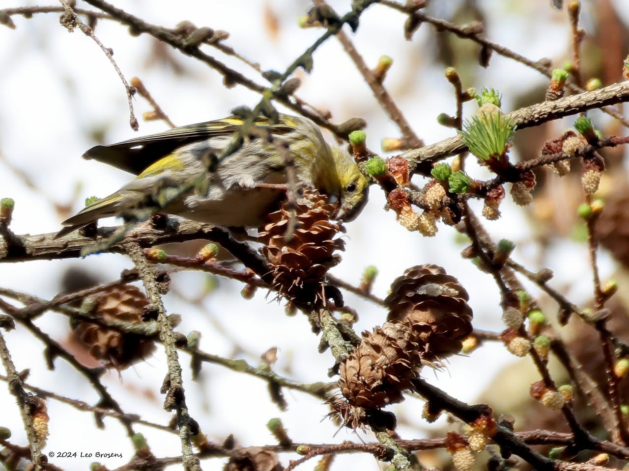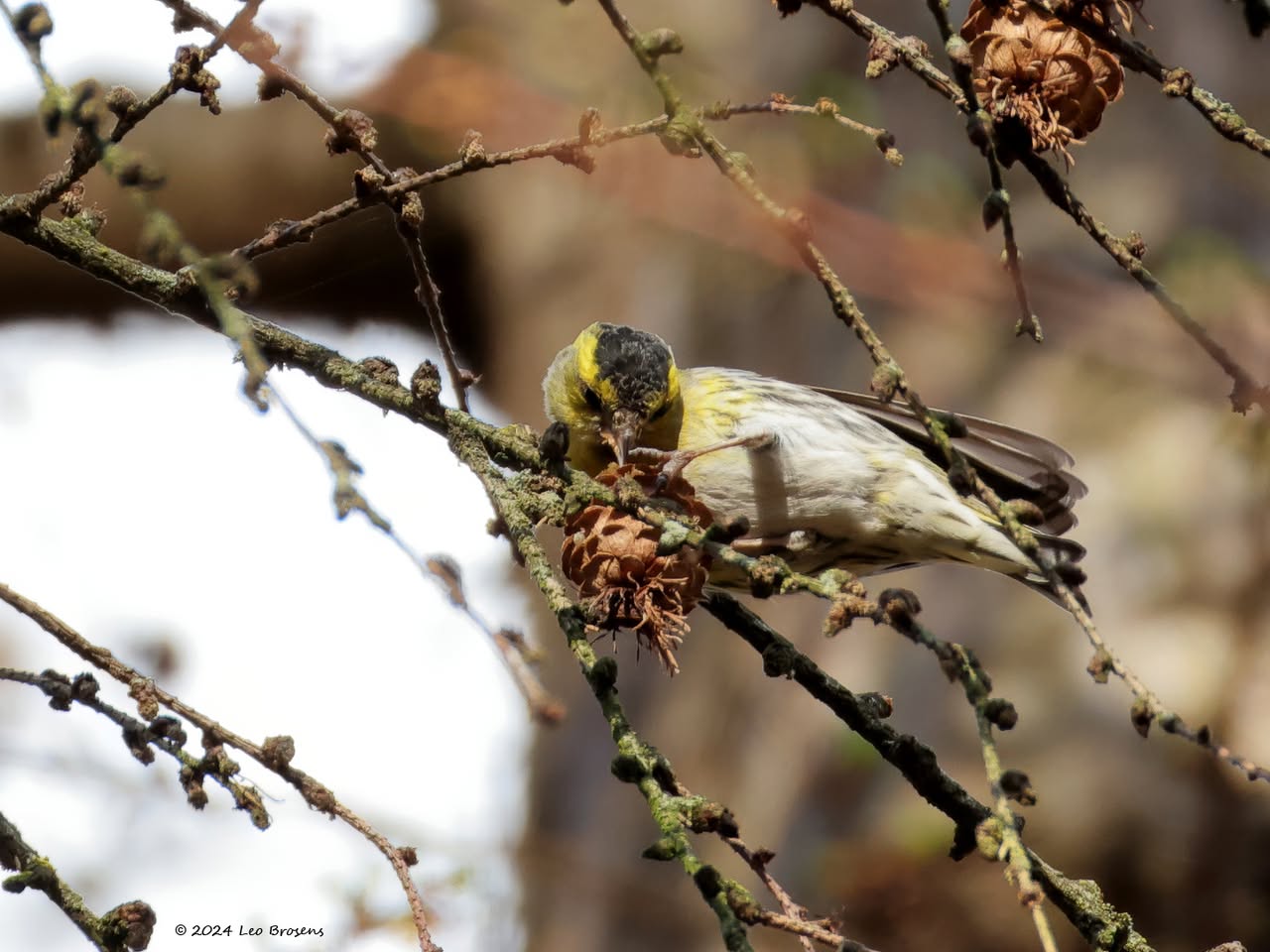Gisteren liet ik het mannetje zien. Maar in het groepje dat ik tegen kwam zaten natuurlijk ook vrouwtjes, zoals dit. Het groepje nam er even rustig de tijd voor om wat berkenzaadjes te eten. Zaadjes genoeg, er wordt mee gemorst. Of zijn het slechts de schilletjes van de zaadjes die weer uit de snavel vallen na uitpeuteren van het feitelijke zaadje?