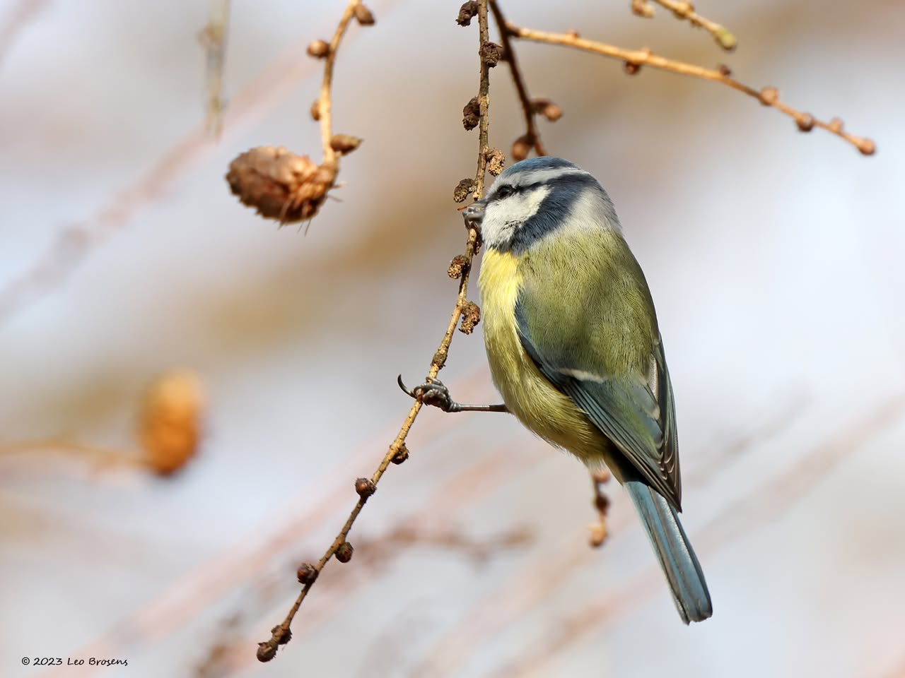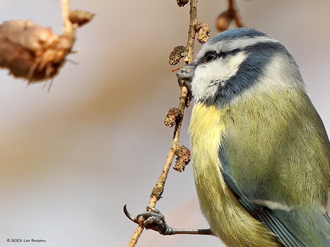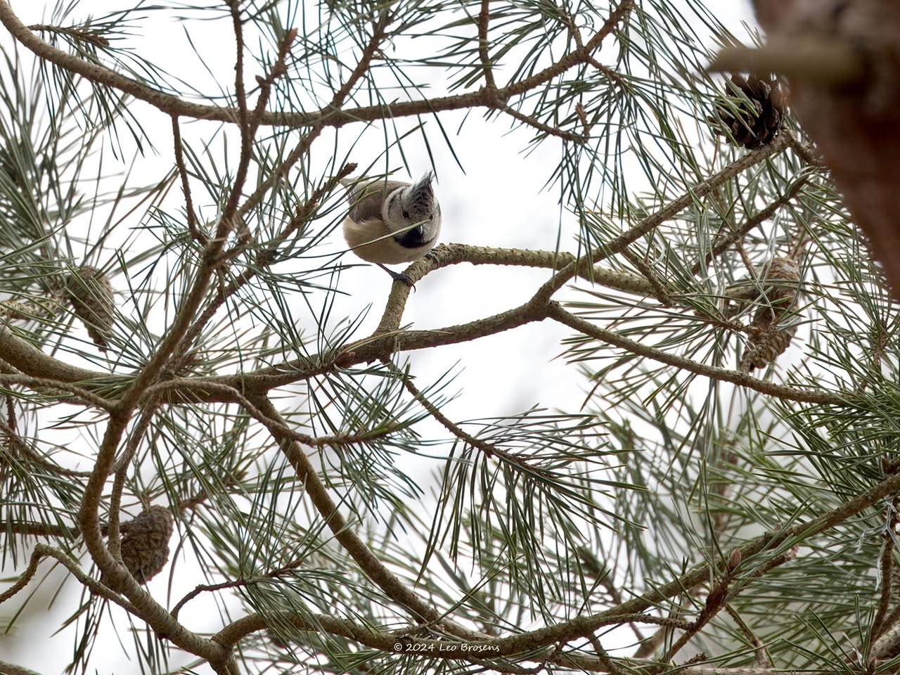 Niet alleen sijsjes zoeken in wintertijd naaldbomen af op iets eetbaars, ook pimpeltjes doen dat. Zo kon ik dit pimpeltje tijdens dat werk vastleggen. Bij goed kijken zag ik dat hij of zij iets aan de haak geslagen had, iets met de snavel te pakken had. Is dat nu een zaadje of een larfje, ze lusten beide nu. Ik denk een larfje, een heel klein rupsje?