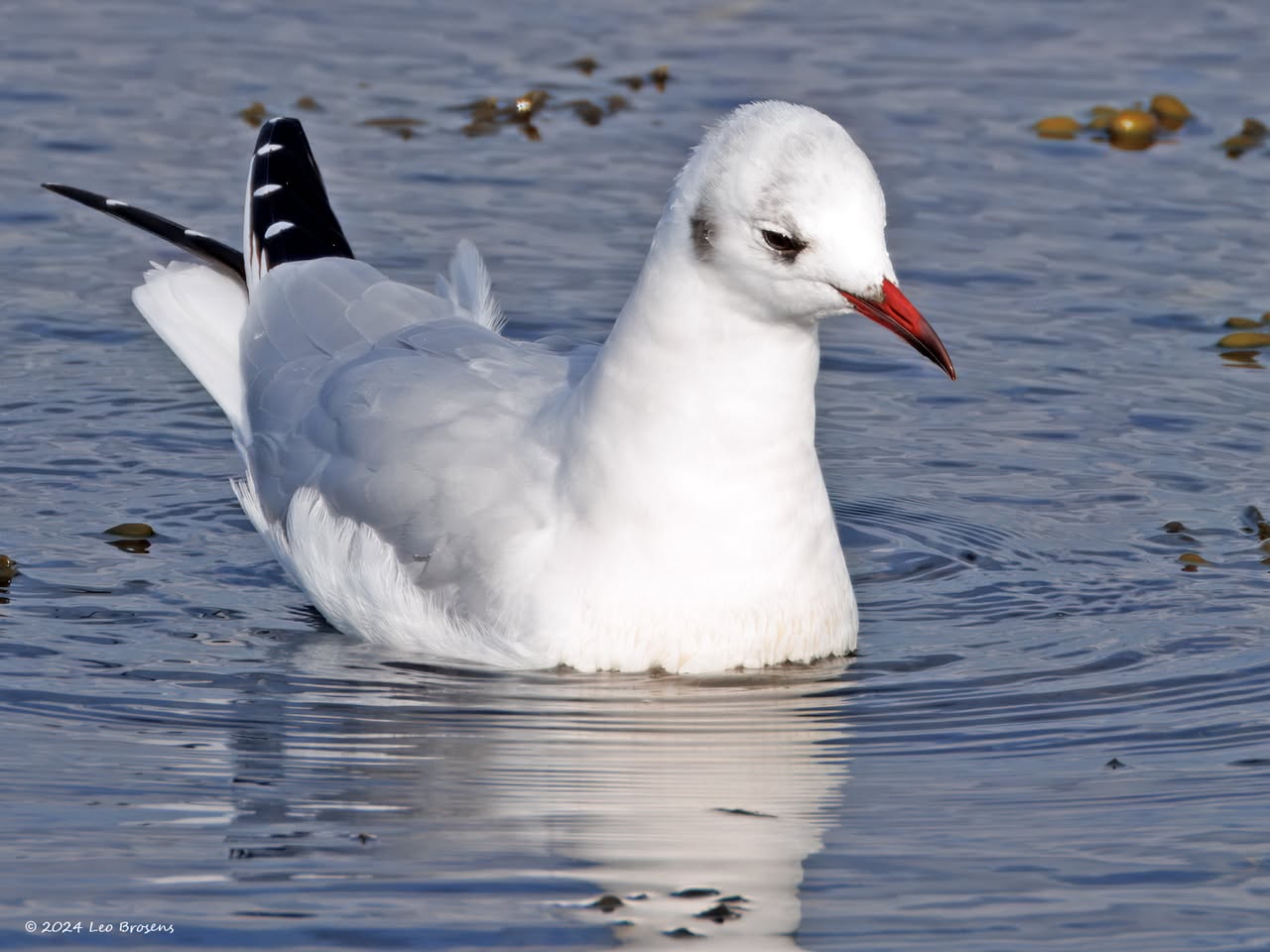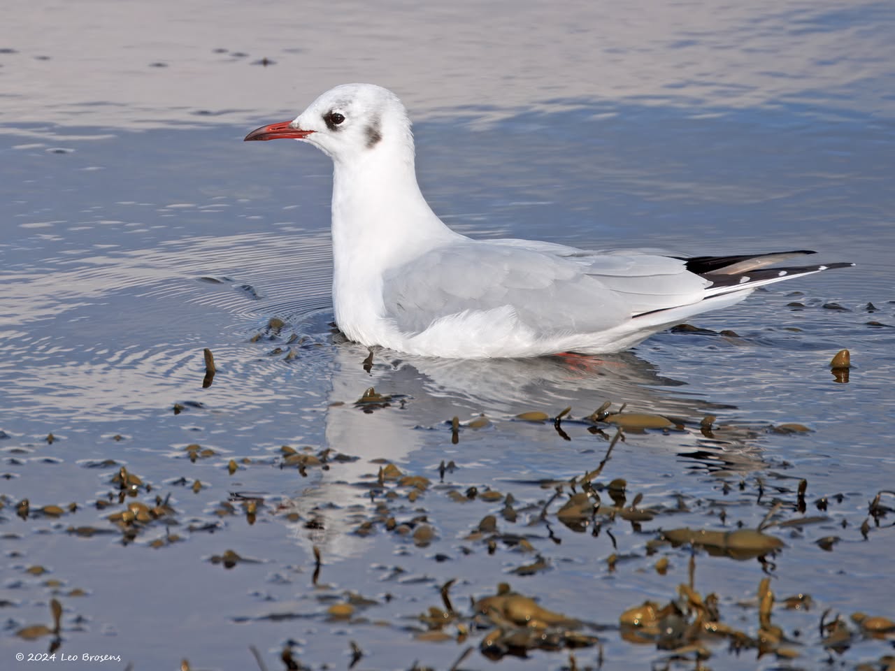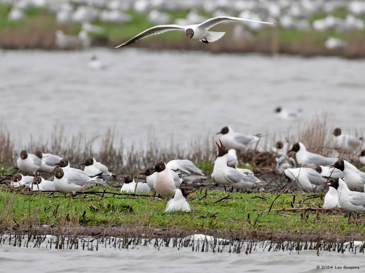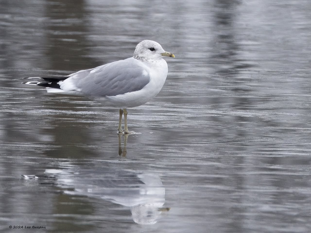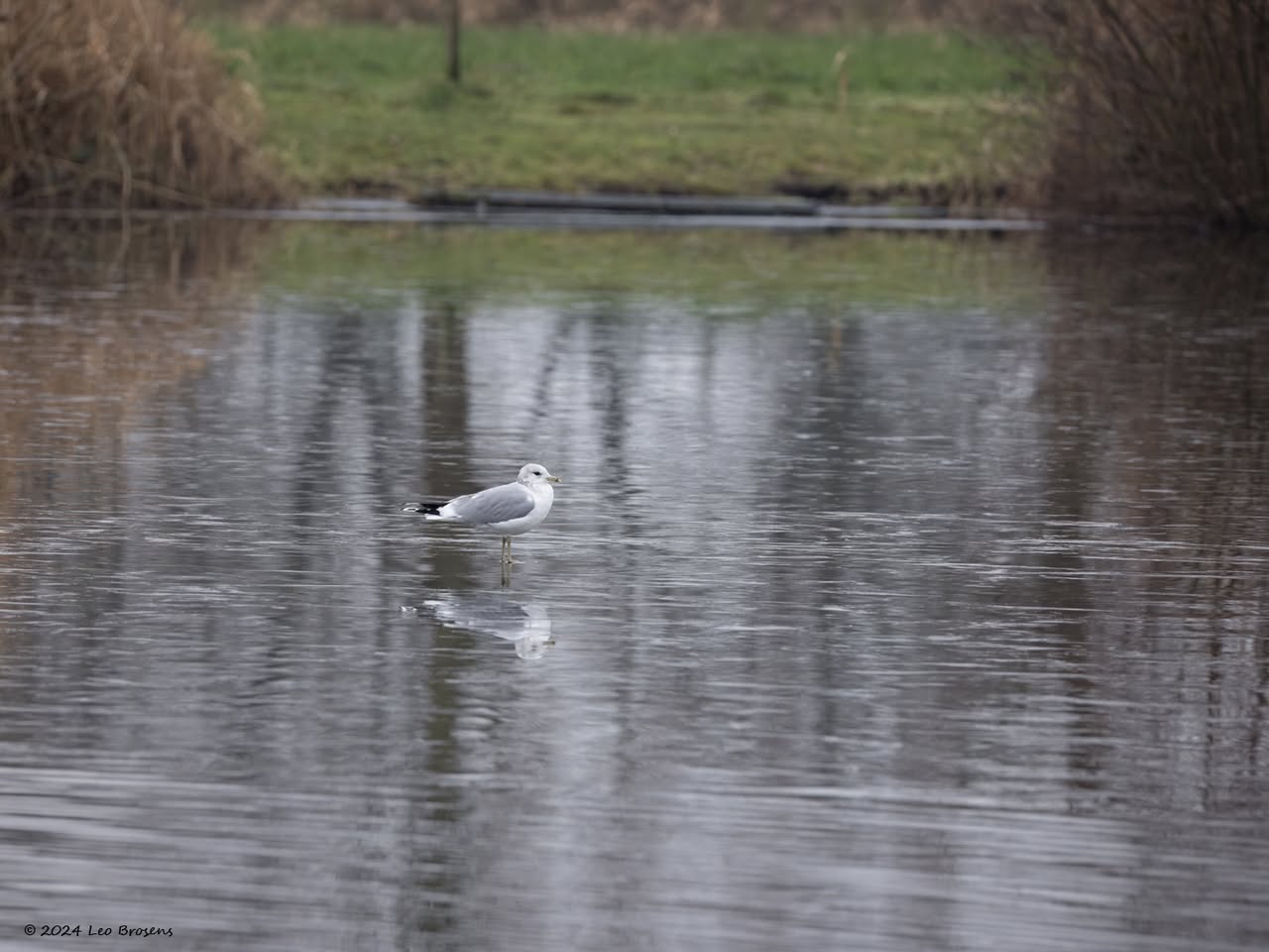 Een wonder! Een stormmeeuw die op water kan staan. Maar nee, zo'n vaart loopt het hier niet. In de leemskuilen was gisteren het laagje ijs al ver weggesmolten, vandaar een laagje water op het ijs. De stormmeeuw kun je nu hier af en toe aantreffen in weilanden. Hij is zichtbaar kleiner dan de zilvermeeuw, heeft geelgroene poten en heeft in winterkleed een donkere dwarsstreep op de snavelpunt. Die snavel is ook veel kleiner dan bij de zilvermeeuw.