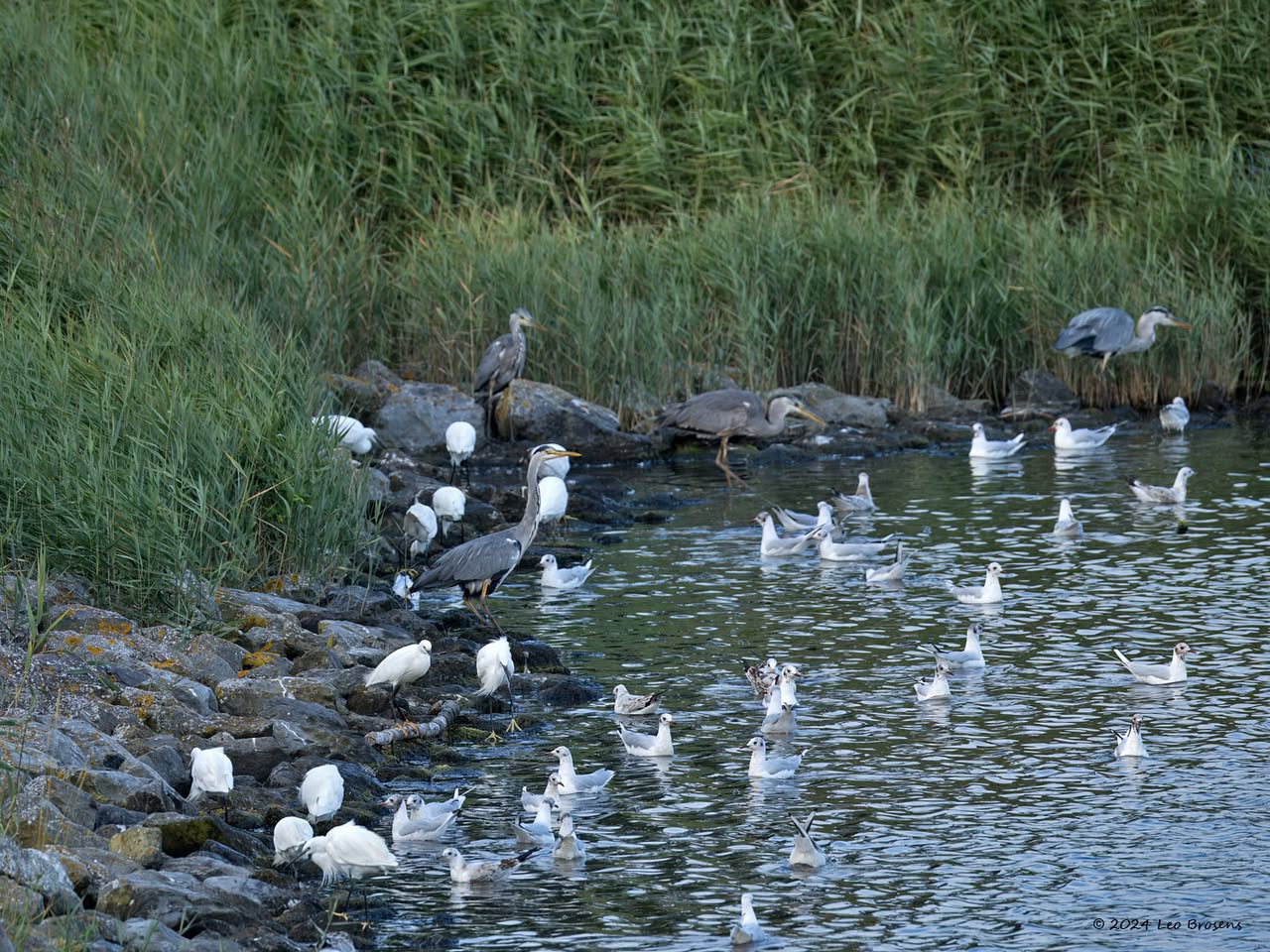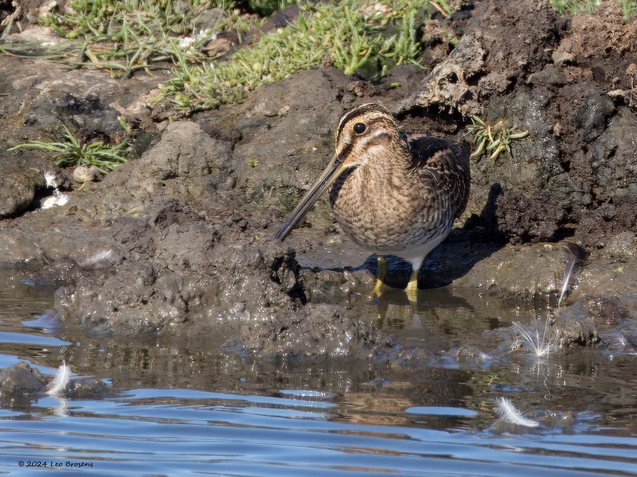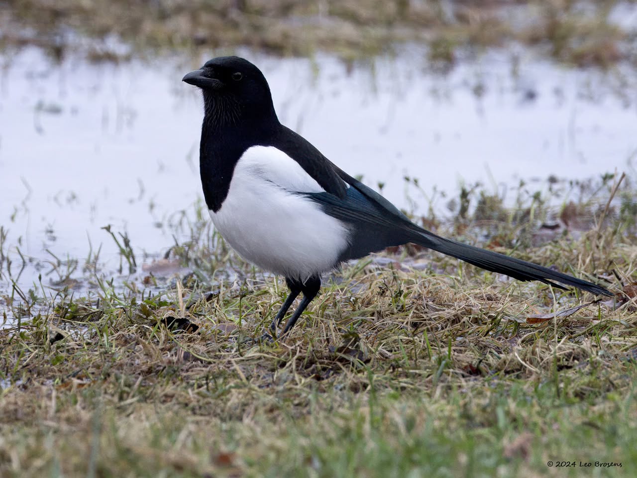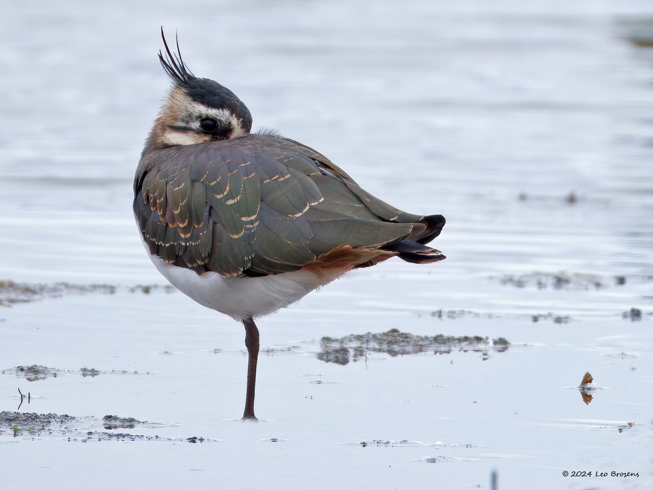 Een wonder! Een stormmeeuw die op water kan staan. Maar nee, zo'n vaart loopt het hier niet. In de leemskuilen was gisteren het laagje ijs al ver weggesmolten, vandaar een laagje water op het ijs. De stormmeeuw kun je nu hier af en toe aantreffen in weilanden. Hij is zichtbaar kleiner dan de zilvermeeuw, heeft geelgroene poten en heeft in winterkleed een donkere dwarsstreep op de snavelpunt. Die snavel is ook veel kleiner dan bij de zilvermeeuw.