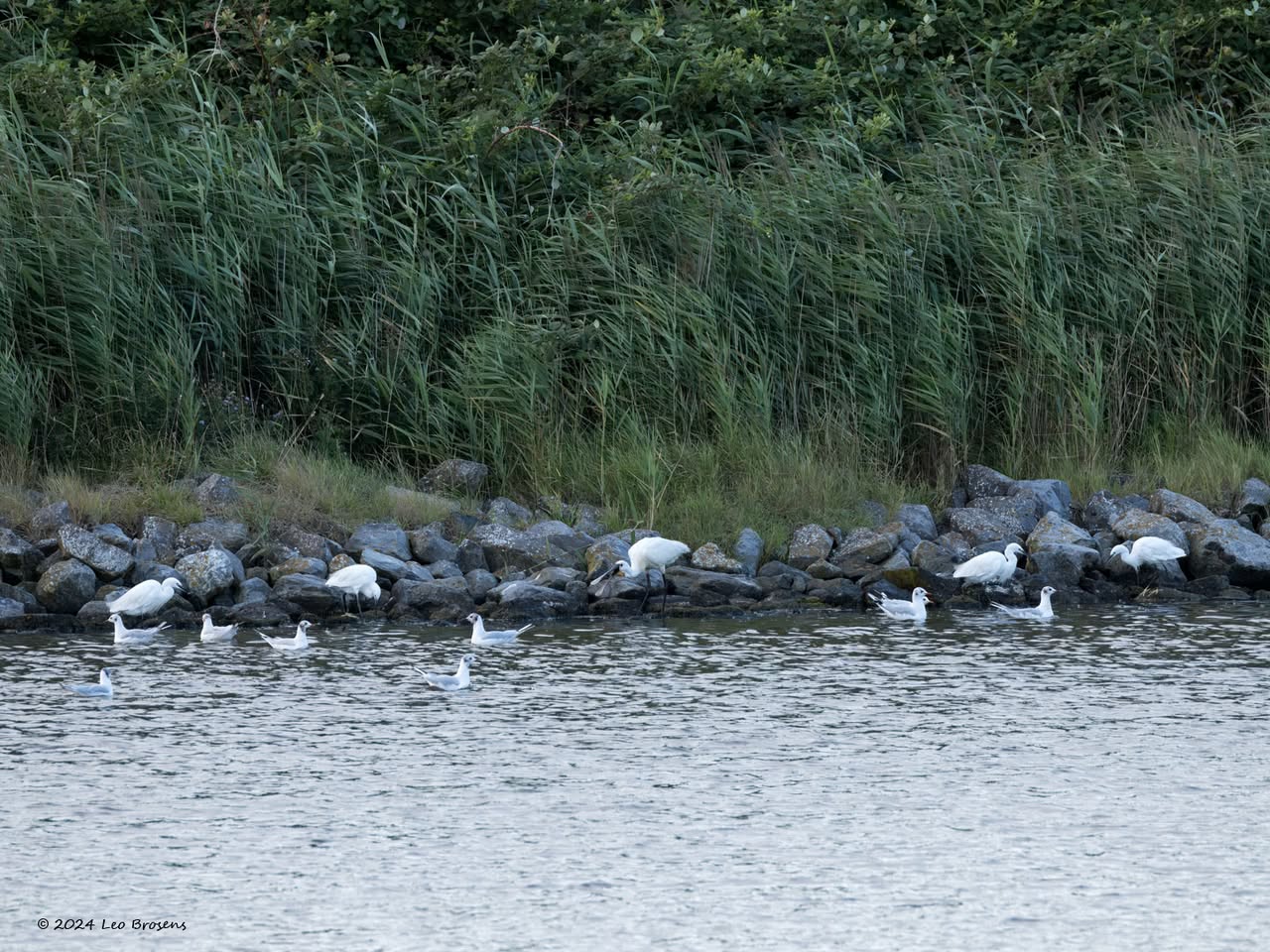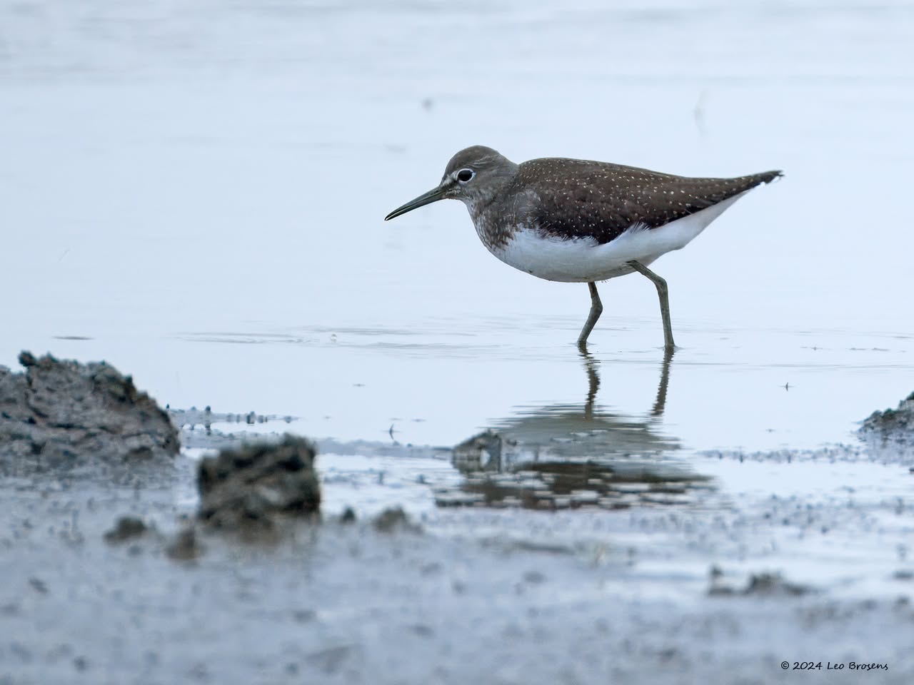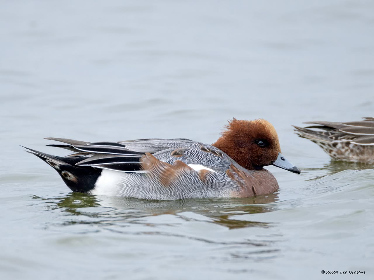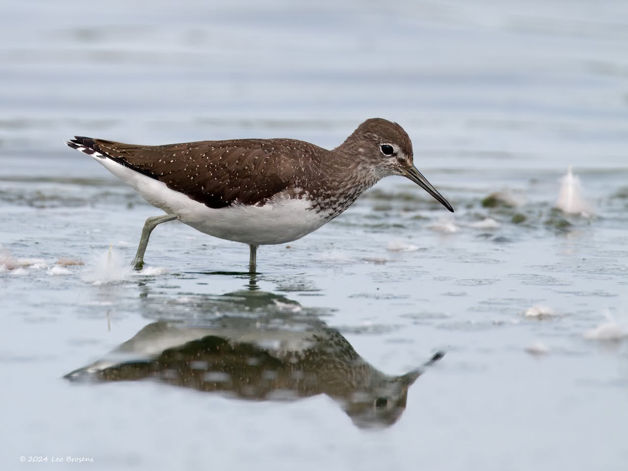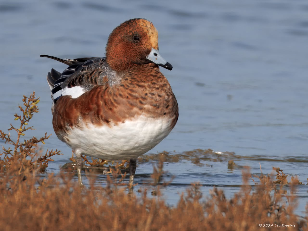 Een wonder! Een stormmeeuw die op water kan staan. Maar nee, zo'n vaart loopt het hier niet. In de leemskuilen was gisteren het laagje ijs al ver weggesmolten, vandaar een laagje water op het ijs. De stormmeeuw kun je nu hier af en toe aantreffen in weilanden. Hij is zichtbaar kleiner dan de zilvermeeuw, heeft geelgroene poten en heeft in winterkleed een donkere dwarsstreep op de snavelpunt. Die snavel is ook veel kleiner dan bij de zilvermeeuw.