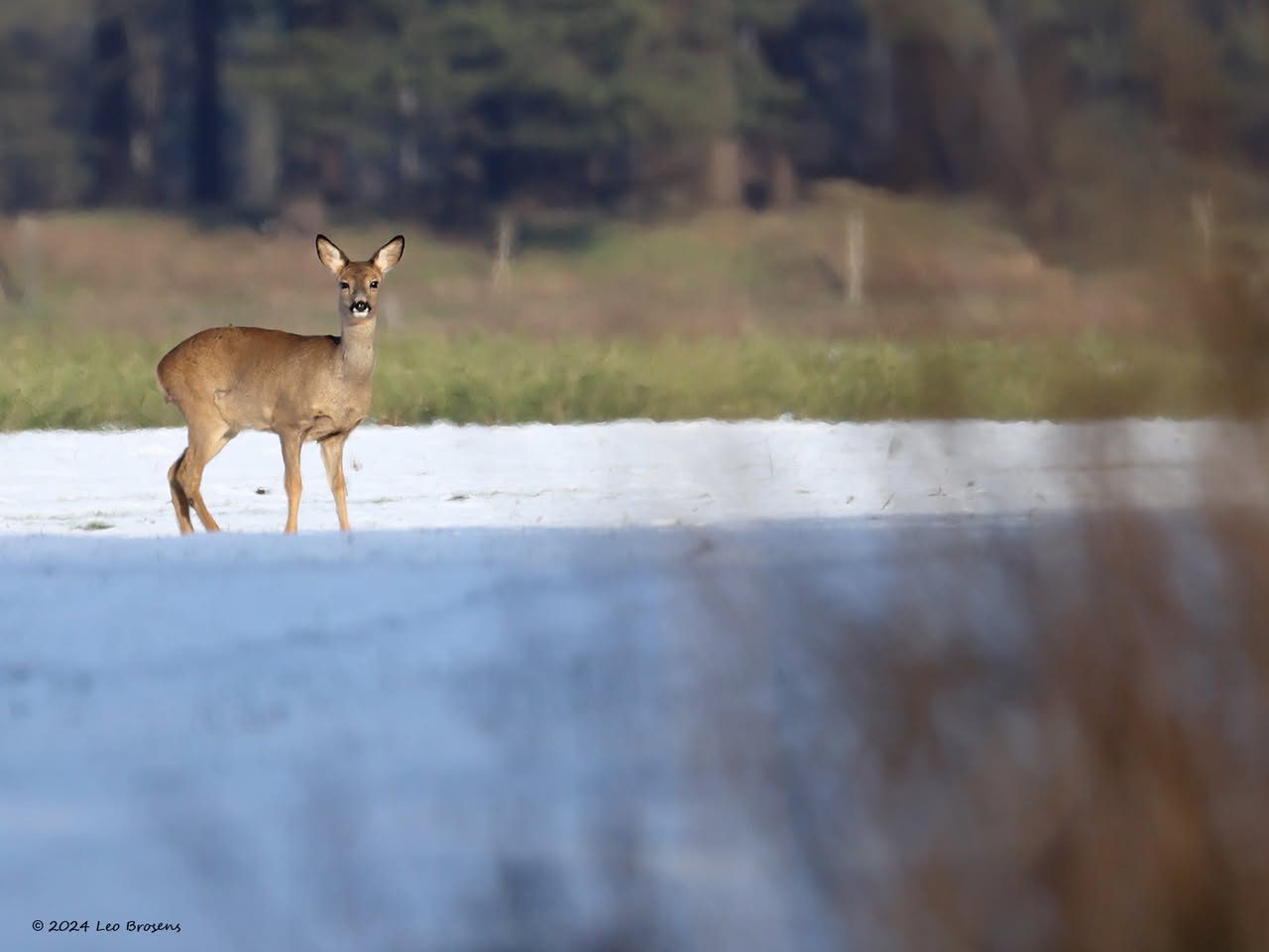 Gistermiddag zag in de Lange Maten op grote afstand een ree een besneeuwde akker oversteken. Ondanks die grote afstand werd ik natuurlijk wel gespot door het mooie dier. Gespot wellicht meer met de oren dan met de ogen? De oorschelpen zijn in ieder geval precies op mij gericht. Voor in het bos te verdwijnen werd nog even terug gekeken naar het mooie witte landschap.