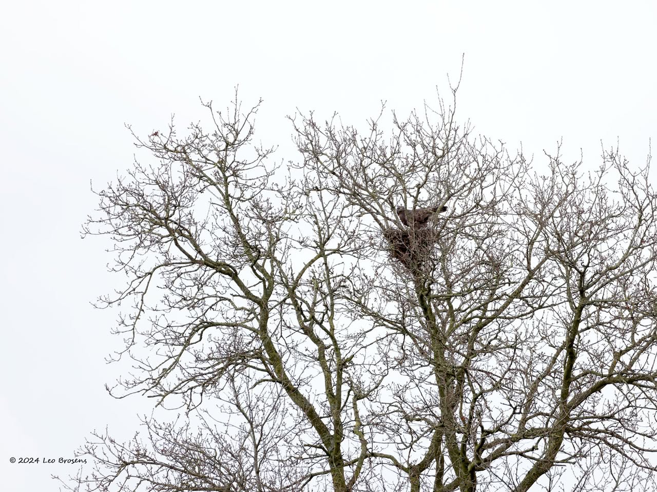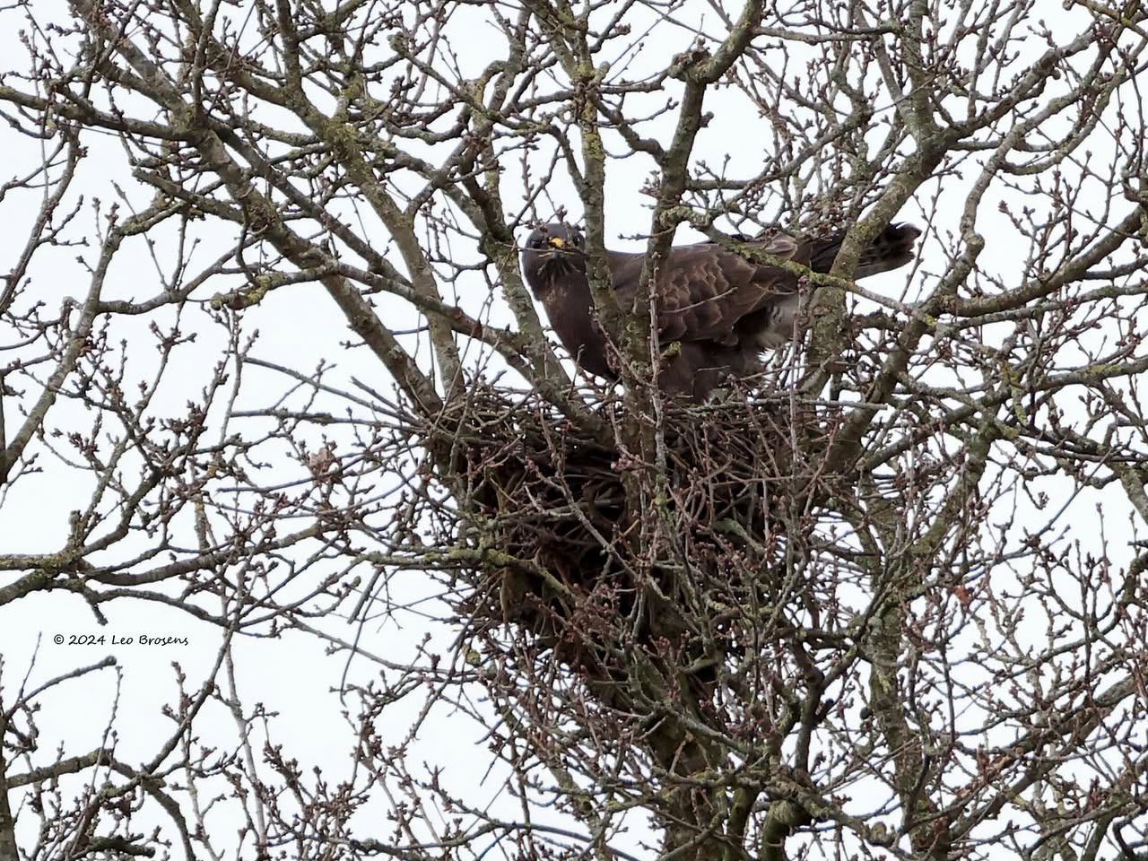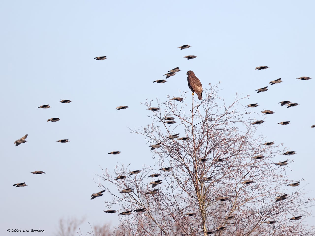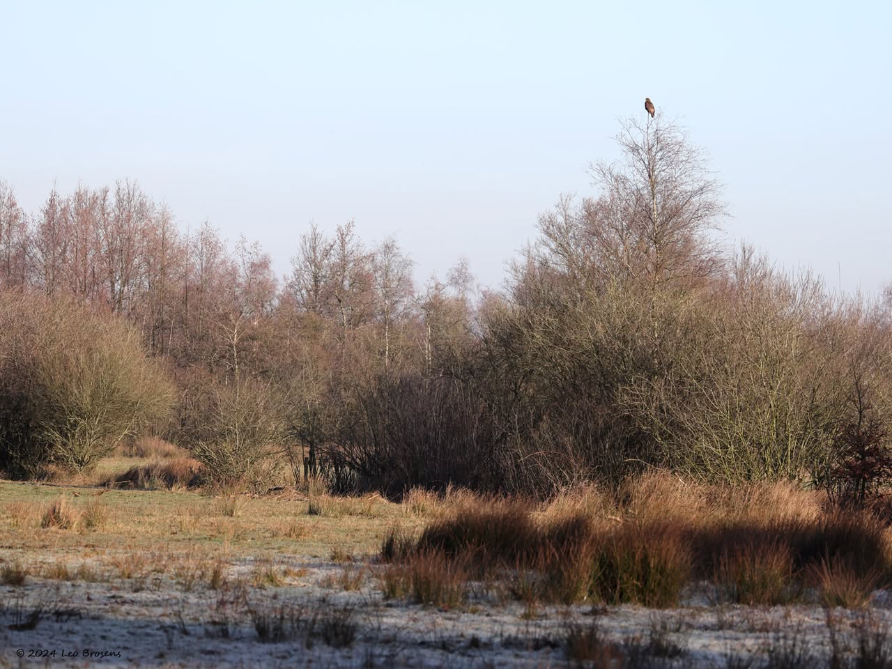 Een stukje natuur in de Pannenhoef, vanmorgen rond tien uur, met een zonnetje en met een buizerd in de top van een boom. Nog leuker wordt het als er een groep spreeuwen voor de buizerd voorbij vliegt. De buizerd vindt dat alles prima.