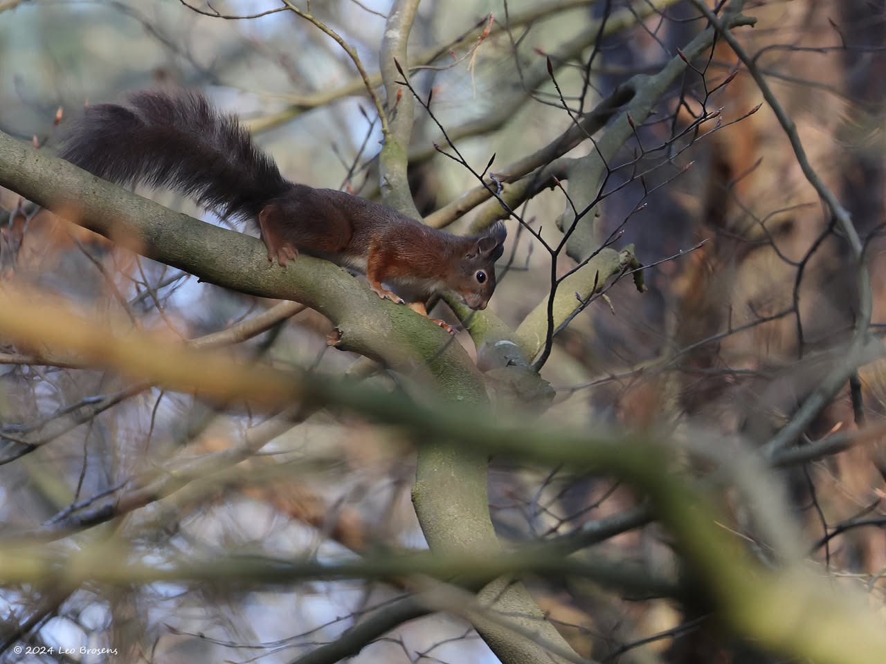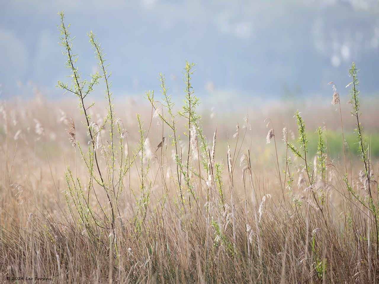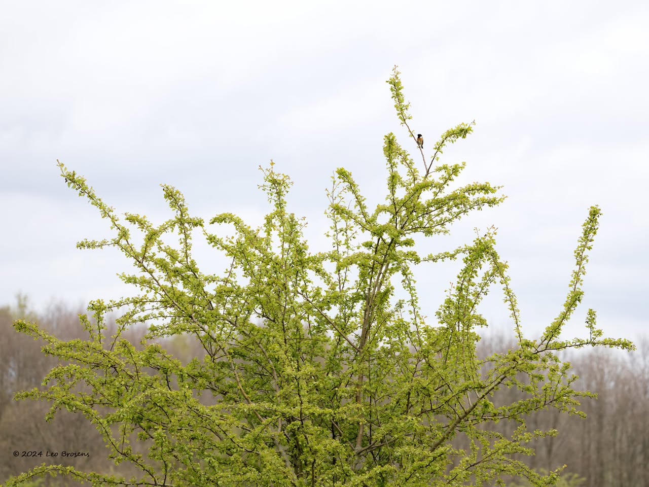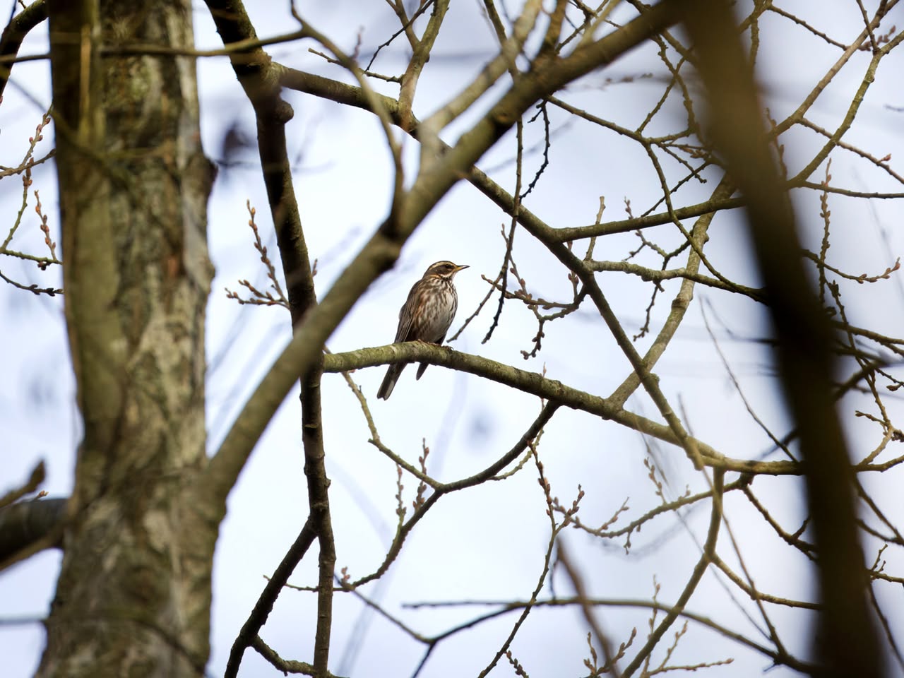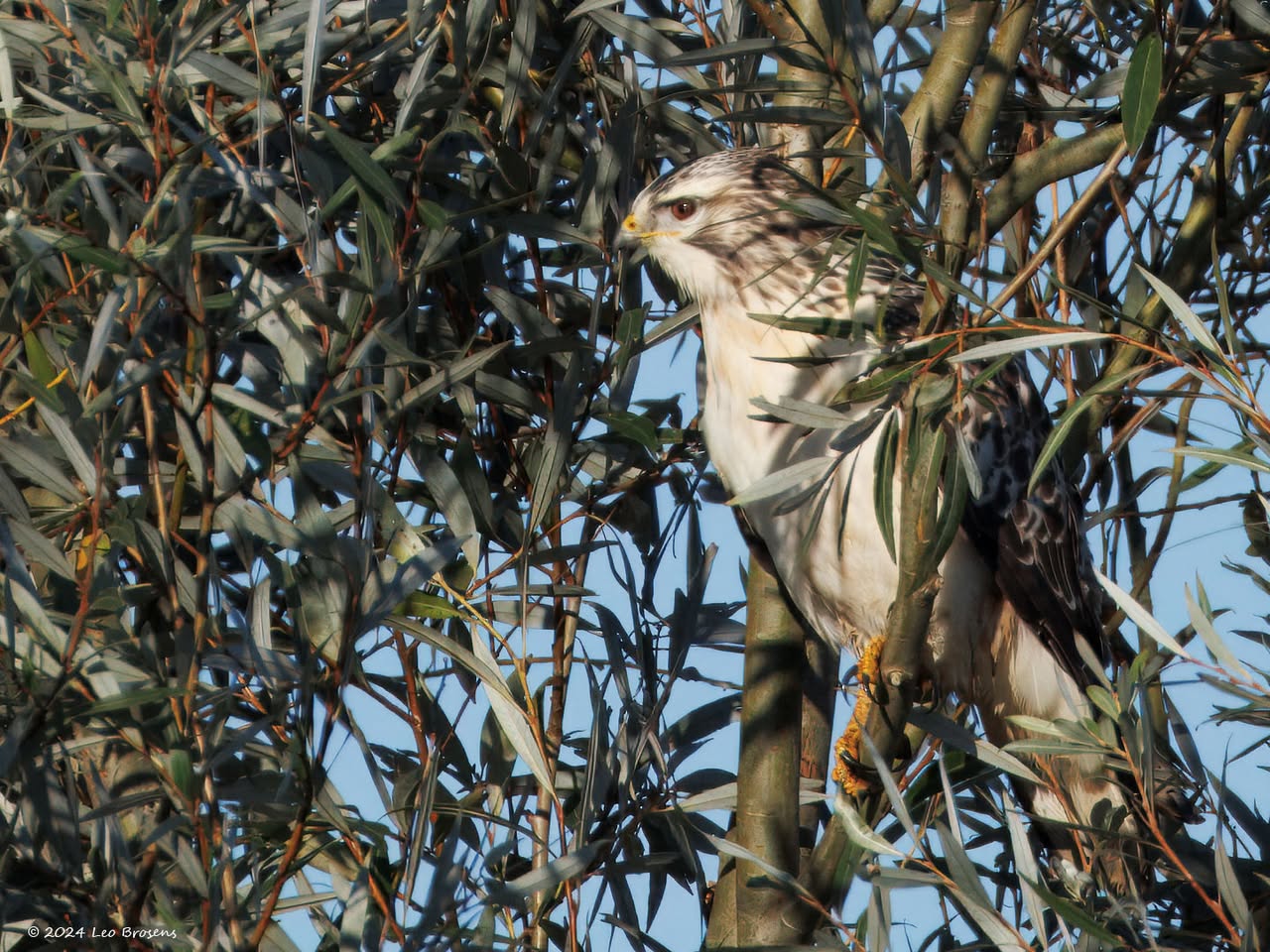 Een stukje natuur in de Pannenhoef, vanmorgen rond tien uur, met een zonnetje en met een buizerd in de top van een boom. Nog leuker wordt het als er een groep spreeuwen voor de buizerd voorbij vliegt. De buizerd vindt dat alles prima.